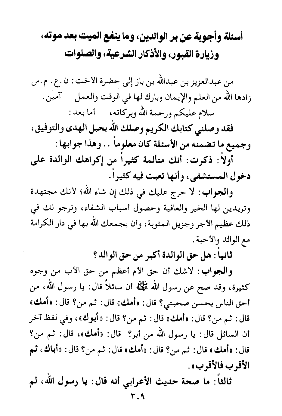 من عبد العزيز بن عبد الله بن باز إلى حضرة الأخت: ن. ع. م. س زادها الله من العلم والإيمان وبارك لها في الوقت والعمل آمين.