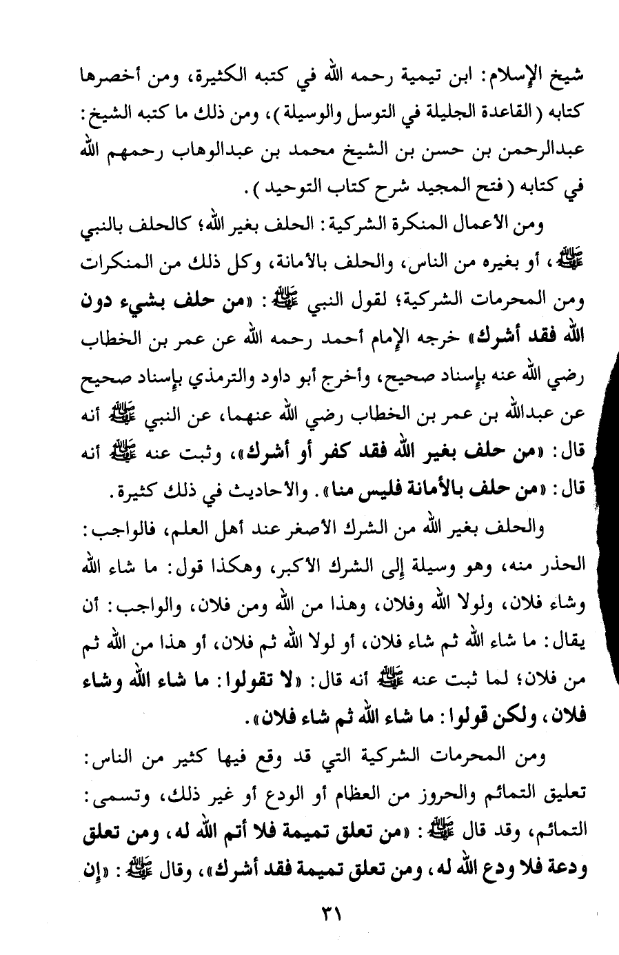 ومن المحرمات الشركية التي قد وقع فيها كثير من الناس: تعليق التمائم والحروز من العظام أو الودع أو غير ذلك، وتسمى: التمائم، وقد قال صلى الله عليه وسلم: «من تعلق تميمة فلا أتم الله له، ومن تعلق ودعة فلا ودع الله له، ومن تعلق تميمة فقد أشرك (¬5) » وقال صلى الله عليه وسلم: «إن