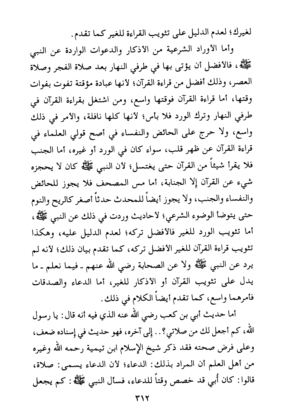 وأما الأوراد الشرعية من الأذكار والدعوات الواردة عن النبي صلى الله عليه وسلم، فالأفضل أن يؤتى بها في طرفي النهار بعد صلاة الفجر وصلاة العصر، وذلك أفضل من قراءة القرآن؛ لأنها عبادة مؤقتة تفوت بفوات وقتها، أما قراءة القرآن فوقتها واسع، ومن اشتغل بقراءة القرآن في طرفي النهار وترك الورد فلا بأس؛ لأنها كلها نافلة، والأمر في ذلك واسع، ولا حرج على الحائض والنفساء في أصح قولي العلماء في قراءة القرآن عن ظهر قلب، سواء كان في الورد أو غيره، أما الجنب فلا يقرأ شيئا من القرآن حتى يغتسل؛ «لأن النبي صلى الله عليه وسلم كان لا يحجزه شيء عن القرآن إلا الجنابة (¬1) » ، أما مس المصحف فلا يجوز للحائض والنفساء والجنب، ولا يجوز أيضا للمحدث حدثا أصغر كالريح والنوم حتى يتوضأ الوضوء الشرعي؛ لأحاديث وردت في ذلك عن النبي صلى الله عليه وسلم، أما تثويب الورد للغير فالأفضل تركه؛ لعدم الدليل عليه، وهكذا تثويب قراءة القرآن للغير الأفضل تركه، كما تقدم بيان ذلك؛ لأنه لم يرد عن النبي صلى الله عليه وسلم ولا عن الصحابة رضي الله عنهم - فيما نعلم- ما يدل على تثويب القرآن أو الأذكار للغير، أما الدعاء والصدقات فأمرهما واسع، كما تقدم أيضا الكلام في ذلك.