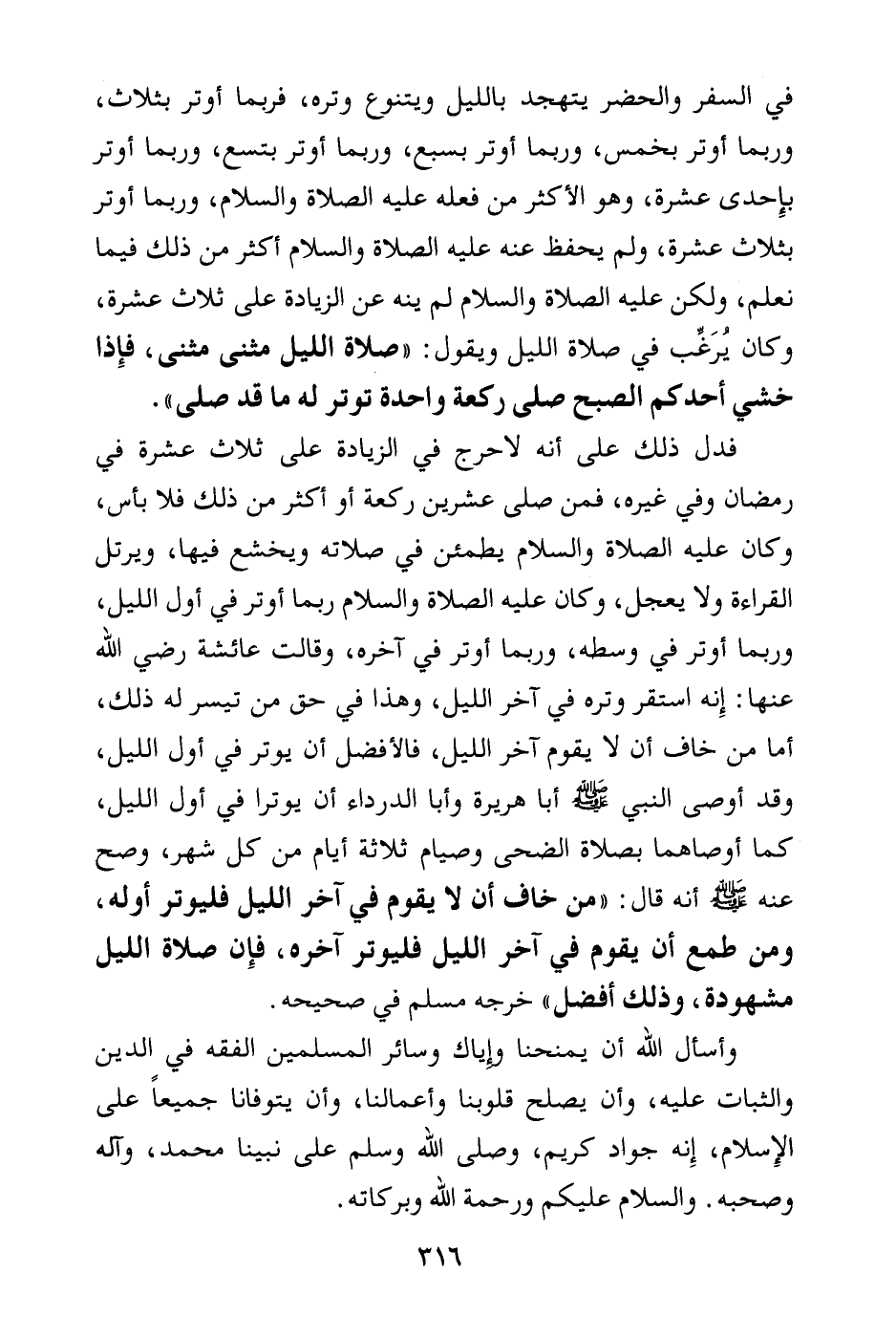 في السفر والحضر يتهجد بالليل ويتنوع وتره، فربما أوتر بثلاث، وربما أوتر بخمس، وربما أوتر بسبع، وربما أوتر بتسع، وربما أوتر بإحدى عشرة، وهو الأكثر من فعله عليه الصلاة والسلام، وربما أوتر بثلاث عشرة، ولم يحفظ عنه عليه الصلاة والسلام أكثر من ذلك فيما نعلم، ولكن عليه الصلاة والسلام لم ينه عن الزيادة على ثلاث عشرة، وكان يرغب في صلاة الليل ويقول: «صلاة الليل مثنى مثنى، فإذا خشي أحدكم الصبح صلى ركعة واحدة توتر له ما قد صلى (¬1) » .