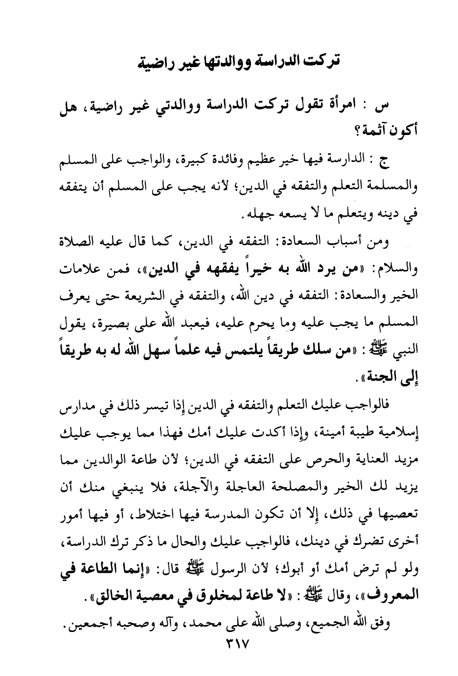 س: امرأة تقول تركت الدراسة ووالدتي غير راضية، هل أكون آثمة؟