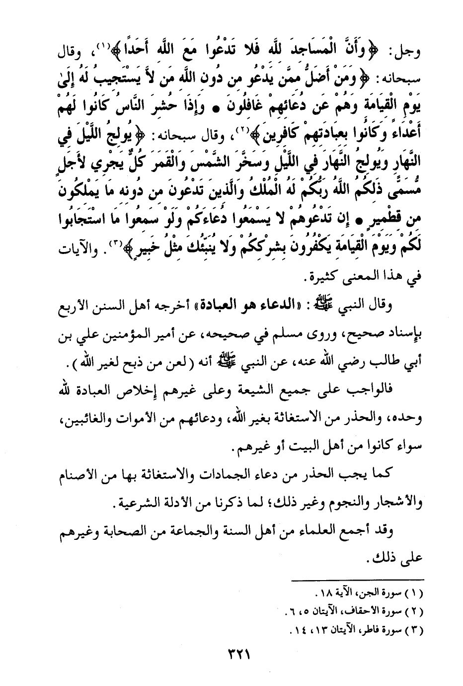 وجل: {وَأَنَّ الْمَسَاجِدَ لِلَّهِ فَلَا تَدْعُوا مَعَ اللَّهِ أَحَدًا} (¬1) وقال سبحانه: {وَمَنْ أَضَلُّ مِمَّنْ يَدْعُو مِنْ دُونِ اللَّهِ مَنْ لَا يَسْتَجِيبُ لَهُ إِلَى يَوْمِ الْقِيَامَةِ وَهُمْ عَنْ دُعَائِهِمْ غَافِلُونَ} (¬2) {وَإِذَا حُشِرَ النَّاسُ كَانُوا لَهُمْ أَعْدَاءً وَكَانُوا بِعِبَادَتِهِمْ كَافِرِينَ} (¬3) وقال سبحانه: {يُولِجُ اللَّيْلَ فِي النَّهَارِ وَيُولِجُ النَّهَارَ فِي اللَّيْلِ وَسَخَّرَ الشَّمْسَ وَالْقَمَرَ كُلٌّ يَجْرِي لِأَجَلٍ مُسَمًّى ذَلِكُمُ اللَّهُ رَبُّكُمْ لَهُ الْمُلْكُ وَالَّذِينَ تَدْعُونَ مِنْ دُونِهِ مَا يَمْلِكُونَ مِنْ قِطْمِيرٍ} (¬4) {إِنْ تَدْعُوهُمْ لَا يَسْمَعُوا دُعَاءَكُمْ وَلَوْ سَمِعُوا مَا اسْتَجَابُوا لَكُمْ وَيَوْمَ الْقِيَامَةِ يَكْفُرُونَ بِشِرْكِكُمْ وَلَا يُنَبِّئُكَ مِثْلُ خَبِيرٍ} (¬5) والآيات في هذا المعنى كثيرة.