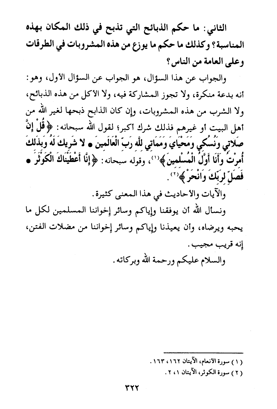 والجواب: عن هذا السؤال، هو الجواب عن السؤال الأول، وهو: أنه بدعة منكرة، ولا تجوز المشاركة فيه، ولا الأكل من هذه الذبائح، ولا الشرب من هذه المشروبات، وإن كان الذابح ذبحها لغير الله من أهل البيت أو غيرهم فذلك شرك أكبر؛ لقول الله سبحانه: {قُلْ إِنَّ صَلَاتِي وَنُسُكِي وَمَحْيَايَ وَمَمَاتِي لِلَّهِ رَبِّ الْعَالَمِينَ} (¬1) {لَا شَرِيكَ لَهُ وَبِذَلِكَ أُمِرْتُ وَأَنَا أَوَّلُ الْمُسْلِمِينَ} (¬2) وقوله سبحانه: {إِنَّا أَعْطَيْنَاكَ الْكَوْثَرَ} (¬3) {فَصَلِّ لِرَبِّكَ وَانْحَرْ} (¬4)