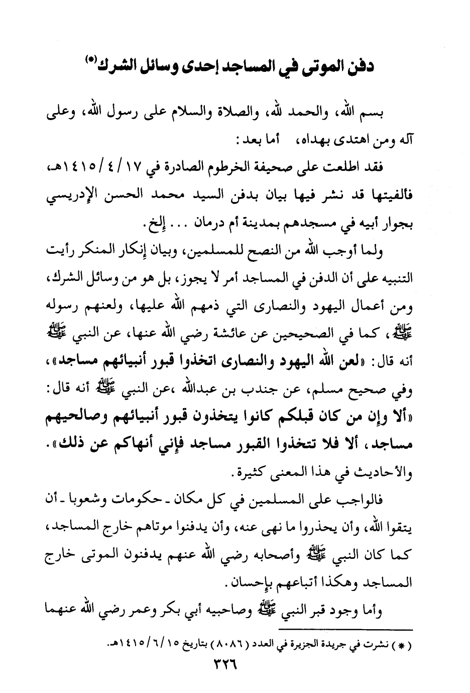 ولما أوجب الله من النصح للمسلمين، وبيان إنكار المنكر رأيت التنبيه على أن الدفن في المساجد أمر لا يجوز، بل هو من وسائل الشرك، ومن أعمال اليهود والنصارى التي ذمهم الله عليها، ولعنهم رسوله صلى الله عليه وسلم، كما في الصحيحين عن عائشة رضي الله عنها، عن النبي صلى الله عليه وسلم أنه قال: «لعن الله اليهود والنصارى اتخذوا قبور أنبيائهم مساجد (¬2) » ، وفي صحيح مسلم، عن جندب بن عبد الله، عن النبي صلى الله عليه وسلم، أنه قال: «ألا وإن من كان قبلكم كانوا يتخذون قبور أنبيائهم وصالحيهم مساجد، ألا فلا تتخذوا القبور مساجد؛ فإني أنهاكم عن ذلك (¬3) » . والأحاديث في هذا المعنى كثيرة.