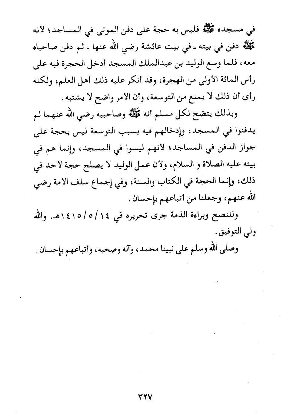 وبذلك يتضح لكل مسلم أنه صلى الله عليه وسلم وصاحبيه رضي الله عنهما لم يدفنوا في المسجد، وإدخالهم فيه بسبب التوسعة ليس بحجة على جواز الدفن في المساجد؛ لأنهم ليسوا في المسجد، وإنما هم في بيته عليه الصلاة والسلام، ولأن عمل الوليد لا يصلح حجة لأحد في ذلك، وإنما الحجة في الكتاب والسنة، وفي إجماع سلف الأمة رضي الله عنهم، وجعلنا من أتباعهم بإحسان.