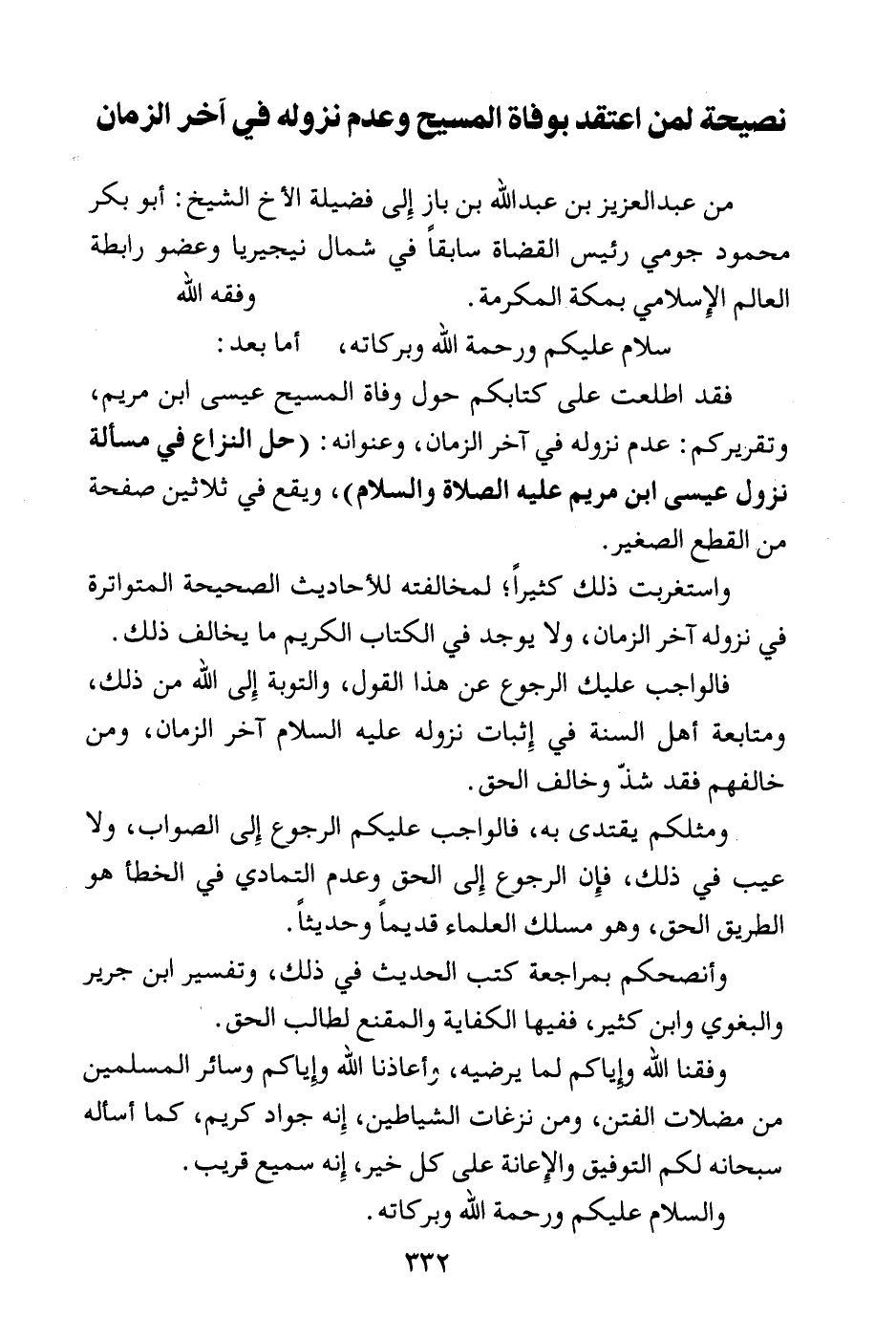 من عبد العزيز بن عبد الله بن باز إلى فضيلة الأخ الشيخ: أبو بكر محمود جومي رئيس القضاة سابقا في شمال نيجيريا وعضو رابطة العالم الإسلامي بمكة المكرمة. وفقه الله
