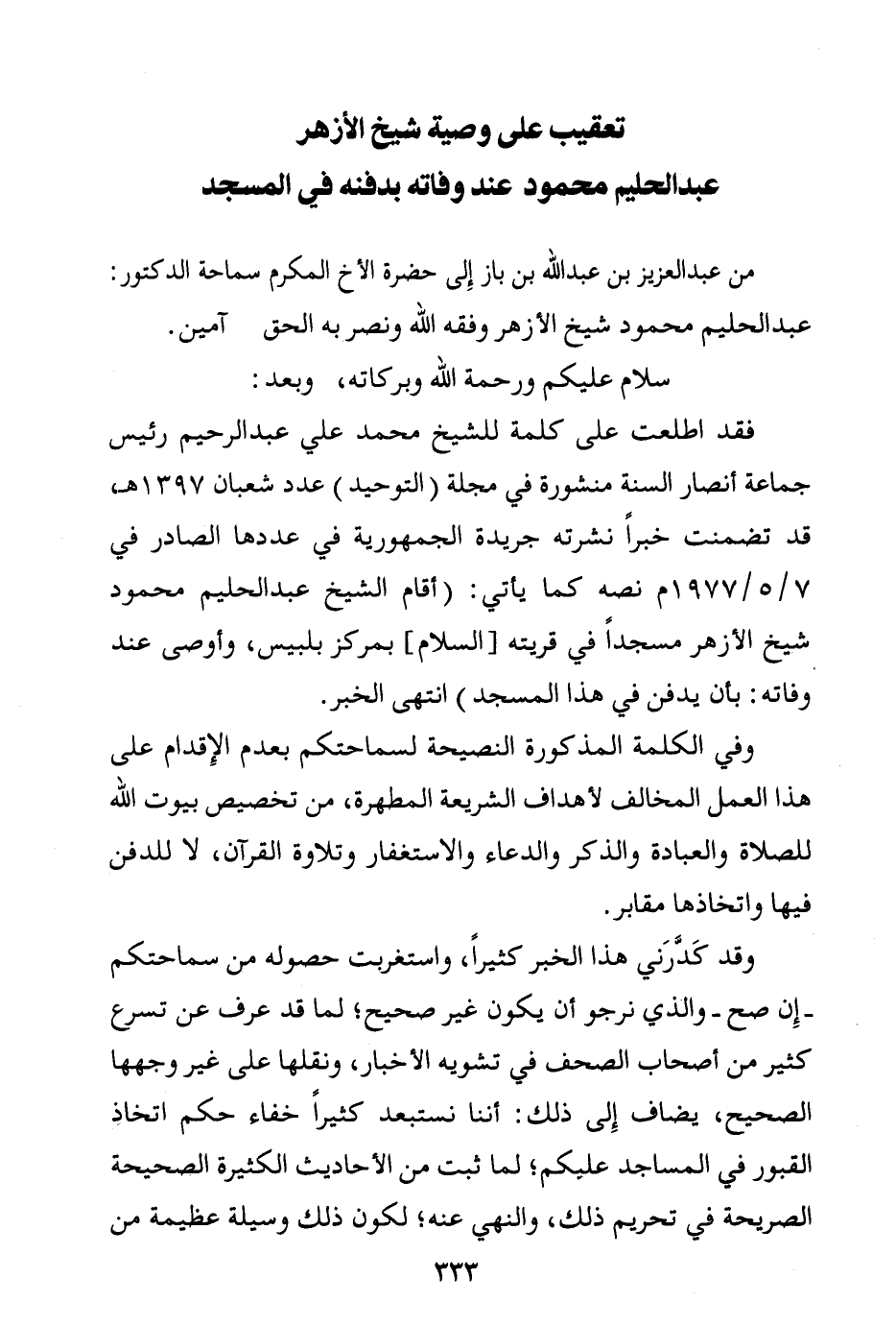 من عبد العزيز بن عبد الله بن باز إلى حضرة الأخ المكرم سماحة الدكتور: عبد الحليم محمود شيخ الأزهر وفقه الله ونصر به الحق آمين.