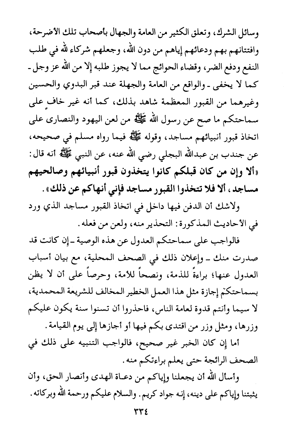 وسائل الشرك، وتعلق الكثير من العامة والجهال بأصحاب تلك الأضرحة، وافتتانهم بهم ودعائهم إياهم من دون الله، وجعلهم شركاء لله في طلب النفع ودفع الضر، وقضاء الحوائج مما لا يجوز طلبه إلا من الله عز وجل -كما لا يخفى- والواقع من العامة والجهلة عند قبر البدوي والحسين وغيرهما من القبور المعظمة شاهد بذلك، كما أنه غير خاف على سماحتكم ما صح عن رسول الله صلى الله عليه وسلم من لعن اليهود والنصارى على اتخاذ قبور أنبيائهم مساجد، وقوله صلى الله عليه وسلم فيما رواه مسلم في صحيحه، عن جندب بن عبد الله البجلي رضي الله عنه، عن النبي صلى الله عليه وسلم أنه قال: «ألا وإن من كان قبلكم كانوا يتخذون قبور أنبيائهم وصالحيهم مساجد، ألا فلا تتخذوا القبور مساجد؛ فإني أنهاكم عن ذلك (¬1) » .