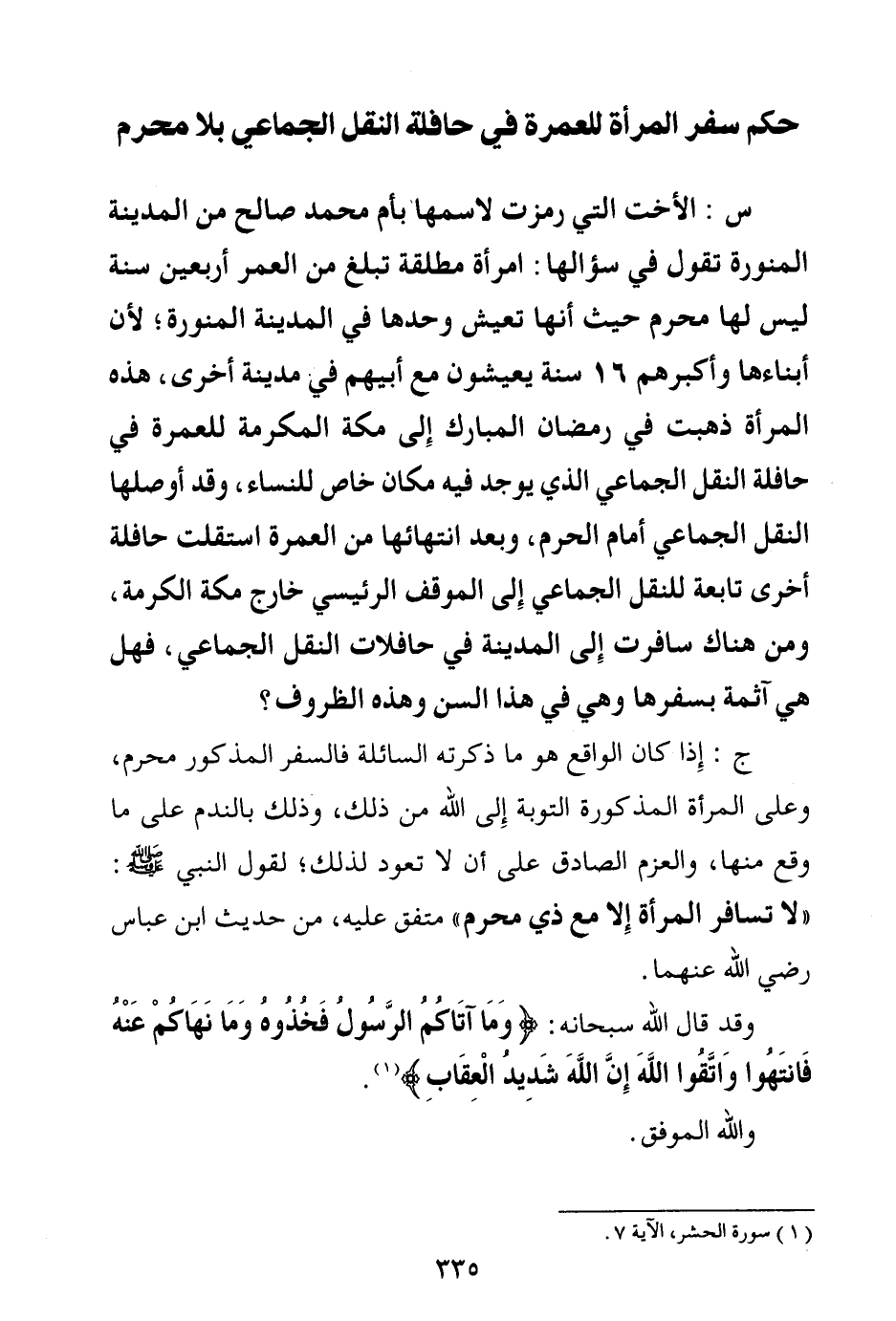 ج: إذا كان الواقع هو ما ذكرته السائلة فالسفر المذكور محرم، وعلى المرأة المذكورة التوبة إلى الله من ذلك، وذلك بالندم على ما وقع منها، والعزم الصادق على أن لا تعود لذلك؛ لقول النبي صلى الله عليه وسلم: «لا تسافر المرأة إلا مع ذي محرم (¬1) » متفق عليه، من حديث ابن عباس رضي الله عنهما. وقد قال الله سبحانه: {وَمَا آتَاكُمُ الرَّسُولُ فَخُذُوهُ وَمَا نَهَاكُمْ عَنْهُ فَانْتَهُوا وَاتَّقُوا اللَّهَ إِنَّ اللَّهَ شَدِيدُ الْعِقَابِ} (¬2)