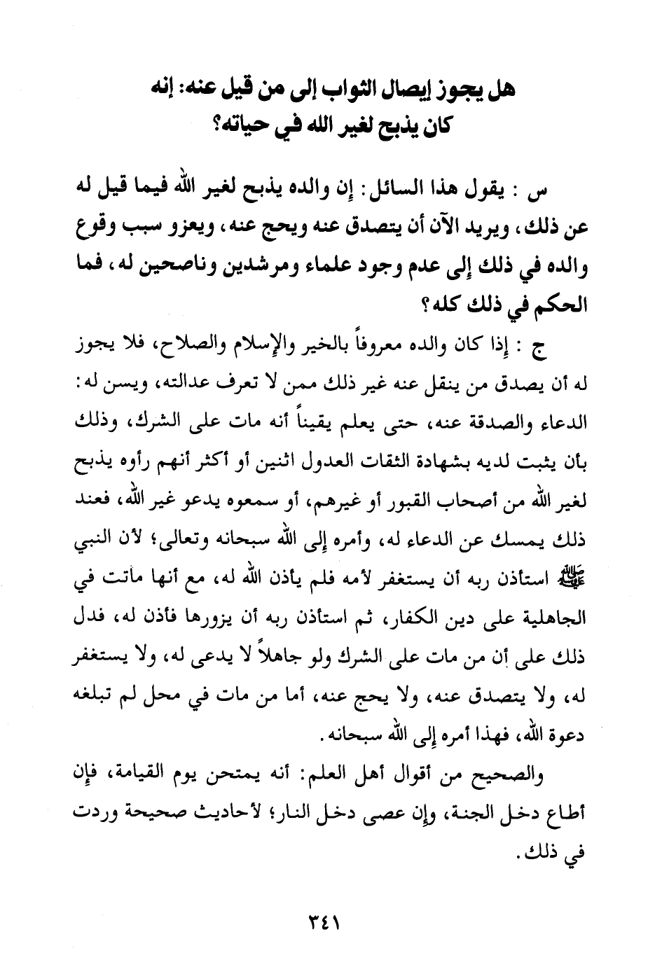 ج: إذا كان والده معروفا بالخير والإسلام والصلاح، فلا يجوز له أن يصدق من ينقل عنه غير ذلك ممن لا تعرف عدالته، ويسن له: الدعاء والصدقة عنه، حتى يعلم يقينا أنه مات على الشرك، وذلك بأن يثبت لديه بشهادة الثقات العدول اثنين أو أكثر أنهم رأوه يذبح لغير الله من أصحاب القبور أو غيرهم، أو سمعوه يدعو غير الله، فعند ذلك يمسك عن الدعاء له، وأمره إلى الله سبحانه وتعالى؛ لأن النبي صلى الله عليه وسلم استأذن ربه أن يستغفر لأمه فلم يأذن الله له، مع أنها ماتت في الجاهلية على دين الكفار، ثم استأذن ربه أن يزورها فأذن له، فدل ذلك على أن من مات على الشرك ولو جاهلا لا يدعى له، ولا يستغفر له، ولا يتصدق عنه، ولا يحح عنه، أما من مات في محل لم تبلغه دعوة الله، فهذا أمره إلى الله سبحانه.
