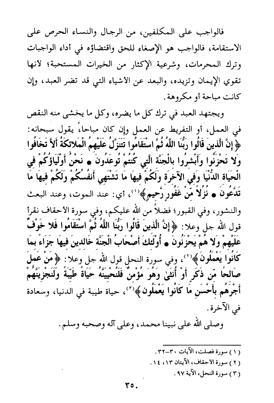 ويجتهد العبد في ترك كل ما يضره، وكل ما يخشى منه النقص في العمل، أو التفريط عن العمل وإن كان مباحا، يقول سبحانه: {إِنَّ الَّذِينَ قَالُوا رَبُّنَا اللَّهُ ثُمَّ اسْتَقَامُوا تَتَنَزَّلُ عَلَيْهِمُ الْمَلَائِكَةُ أَلَّا تَخَافُوا وَلَا تَحْزَنُوا وَأَبْشِرُوا بِالْجَنَّةِ الَّتِي كُنْتُمْ تُوعَدُونَ} (¬1) {نَحْنُ أَوْلِيَاؤُكُمْ فِي الْحَيَاةِ الدُّنْيَا وَفِي الْآخِرَةِ وَلَكُمْ فِيهَا مَا تَشْتَهِي أَنْفُسُكُمْ وَلَكُمْ فِيهَا مَا تَدَّعُونَ} (¬2) {نُزُلًا مِنْ غَفُورٍ رَحِيمٍ} (¬3) أي: عند الموت، وعند البعث والنشور، وفي القبور؛ فضلا من الله عليكم، وفي سورة الأحقاف نقرأ قول الله جل وعلا: {إِنَّ الَّذِينَ قَالُوا رَبُّنَا اللَّهُ ثُمَّ اسْتَقَامُوا فَلَا خَوْفٌ عَلَيْهِمْ وَلَا هُمْ يَحْزَنُونَ} (¬4) {أُولَئِكَ أَصْحَابُ الْجَنَّةِ خَالِدِينَ فِيهَا جَزَاءً بِمَا كَانُوا يَعْمَلُونَ} (¬5) وفي سورة النحل قول الله جل وعلا: {مَنْ عَمِلَ صَالِحًا مِنْ ذَكَرٍ أَوْ أُنْثَى وَهُوَ مُؤْمِنٌ فَلَنُحْيِيَنَّهُ حَيَاةً طَيِّبَةً وَلَنَجْزِيَنَّهُمْ أَجْرَهُمْ بِأَحْسَنِ مَا كَانُوا يَعْمَلُونَ} (¬6) حياة طيبة في الدنيا، وسعادة في الآخرة. وصلى الله على نبينا محمد، وعلى آله وصحبه وسلم.
