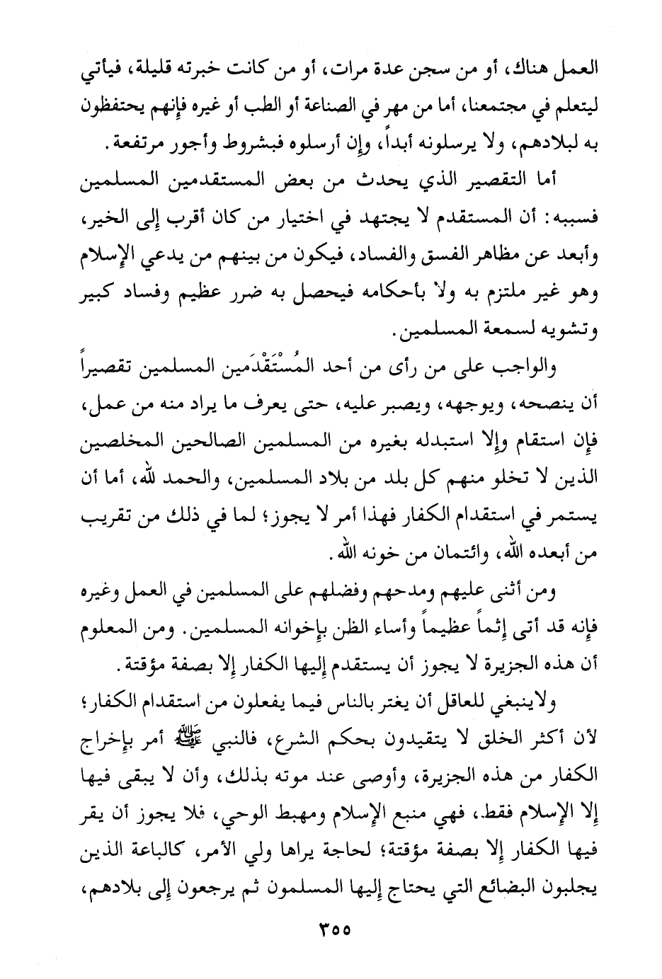 ولا ينبغي للعاقل أن يغتر بالناس فيما يفعلون من استقدام الكفار ; لأن أكثر الخلق لا يتقيدون بحكم الشرع، فالنبي صلى الله عليه وسلم أمر بإخراج الكفار من هذه الجزيرة، وأوصى عند موته بذلك، وأن لا يبقى فيها إلا الإسلام فقط، فهي منبع الإسلام ومهبط الوحي، فلا يجوز أن يقر فيها الكفار إلا بصفة مؤقتة، لحاجة يراها ولي الأمر، كالباعة الذين يجلبون البضائع التي يحتاج إليها المسلمون ثم يرجعون إلى بلادهم،