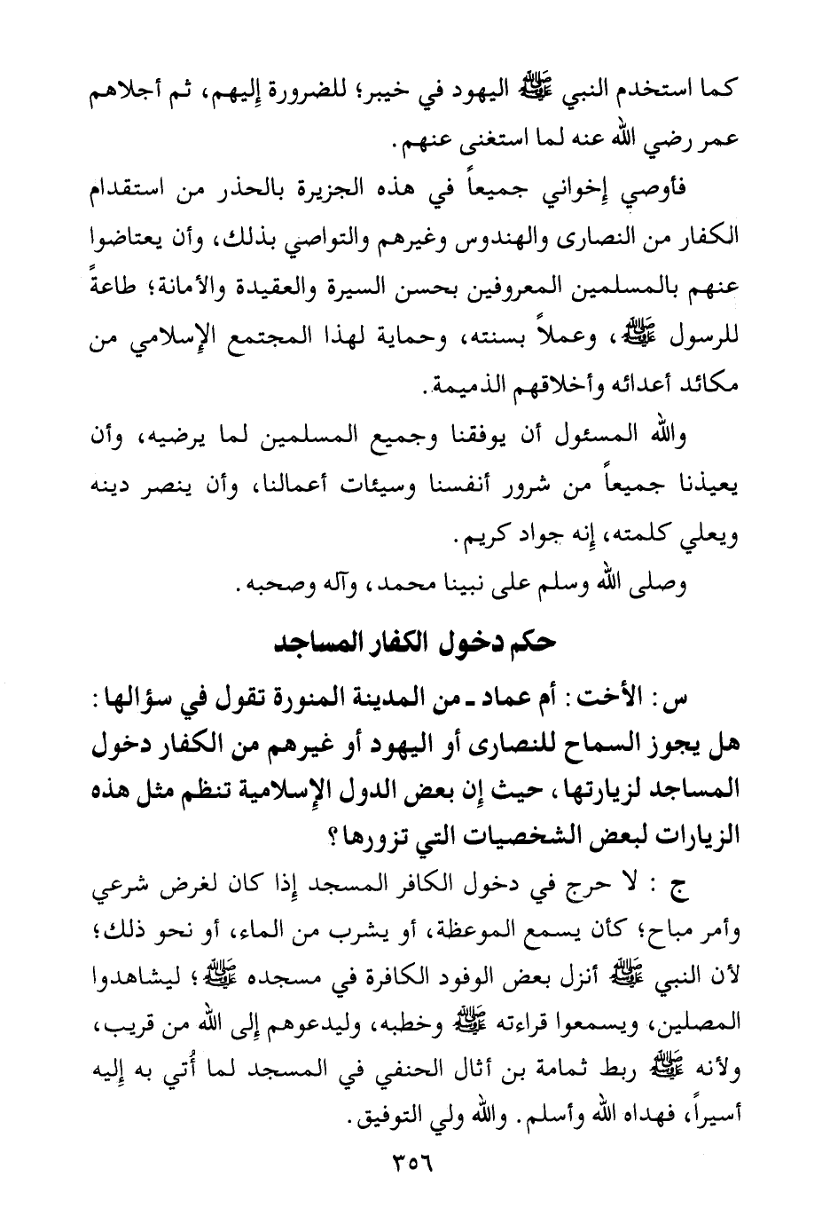 س: الأخت: أم عماد - من المدينة المنورة تقول في سؤالها: هل يجوز السماح للنصارى أو اليهود أو غيرهم من الكفار دخول المساجد لزيارتها؛ حيث إن بعض الدول الإسلامية تنظم مثل هذه الزيارات لبعض الشخصيات التي تزورها؟