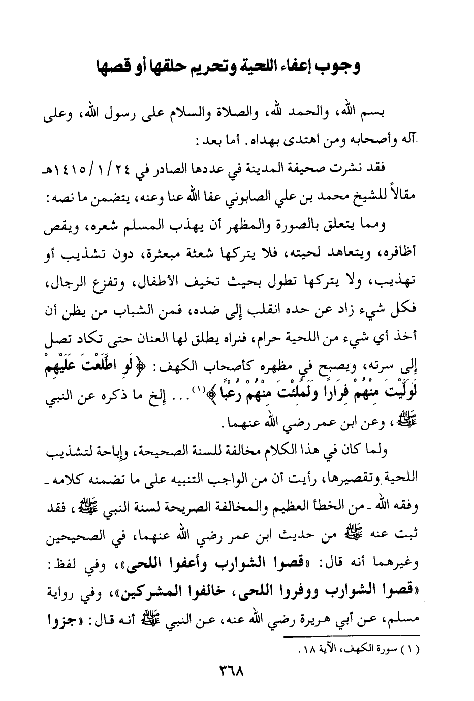 ولما كان في هذا الكلام مخالفة للسنة الصحيحة، وإباحة لتشذيب اللحية وتقصيرها، رأيت أن من الواجب التنبيه على ما تضمنه كلامه- وفقه الله- من الخطأ العظيم والمخالفة الصريحة لسنة النبي صلى الله عليه وسلم، فقد ثبت عنه صلى الله عليه وسلم من حديث ابن عمر رضي الله عنهما، في الصحيحين وغيرهما أنه قال: «قصوا الشوارب وأعفوا اللحى (¬2) » ، وفي لفظ: «قصوا الشوارب ووفروا اللحى خالفوا المشركين (¬3) » ، وفي رواية مسلم، عن أبي هريرة رضي الله عنه، عن النبي صلى الله عليه وسلم أنه قال: «جزوا