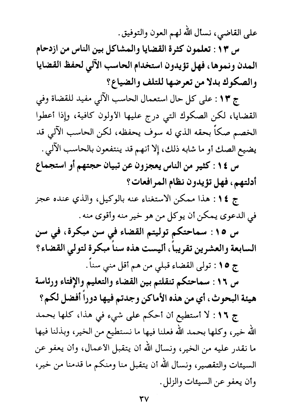 ج13: على كل حال استعمال الحاسب الآلي مفيد للقضاة وفي القضايا، لكن الصكوك التي درج عليها الأولون كافية، وإذا أعطوا الخصم صكا بحقه الذي له سوف يحفظه، لكن الحاسب الآلي قد يضيع الصك أو ما شابه ذلك، إلا أنهم قد ينتفعون بالحاسب الآلي.