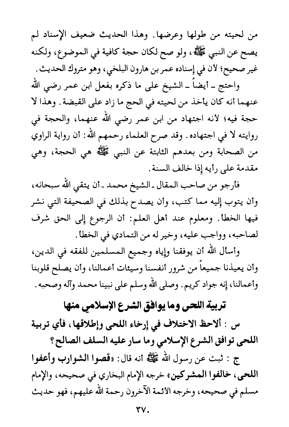 واحتج -أيضا- الشيخ على ما ذكره بفعل ابن عمر رضي الله عنهما أنه كان يأخذ من لحيته في الحج ما زاد على القبضة. وهذا لا حجة فيه؛ لأنه اجتهاد من ابن عمر رضي الله عنهما، والحجة في روايته لا في اجتهاده.