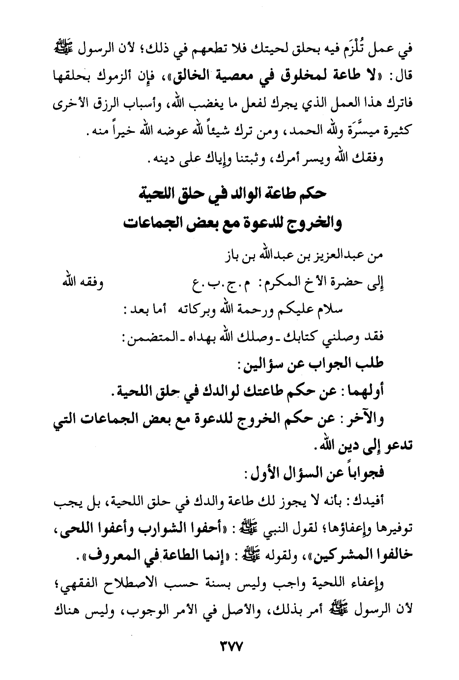 أولهما: عن حكم طاعتك لوالدك في حلق اللحية. والآخر: عن حكم الخروج للدعوة مع بعض الجماعات التي تدعو إلى دين الله.