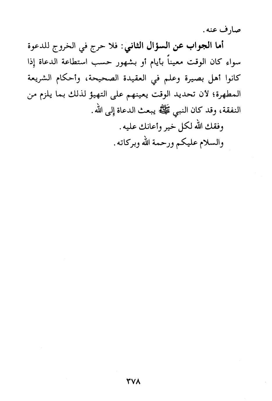 أما الجواب عن السؤال الثاني: فلا حرج في الخروج للدعوة سواء كان الوقت معينا بأيام أو بشهور حسب استطاعة الدعاة إذا كانوا أهل بصيرة وعلم في العقيدة الصحيحة، وأحكام الشريعة المطهرة؛ لأن تحديد الوقت يعينهم على التهيؤ لذلك بما يلزم من النفقة، وقد كان النبي صلى الله عليه وسلم يبعث الدعاة إلى الله.