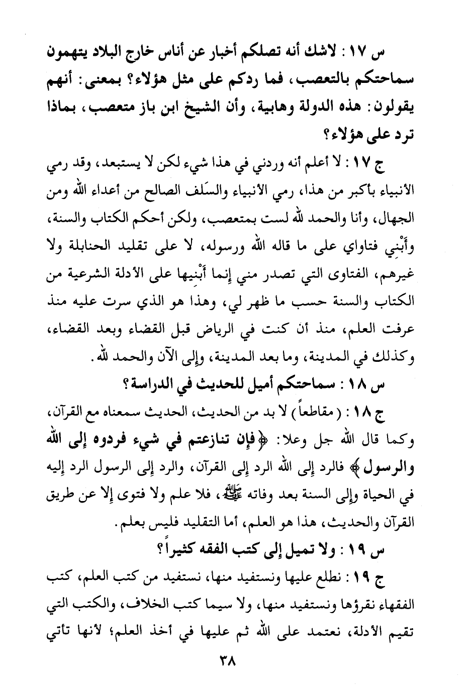 ج17: لا أعلم أنه وردني في هذا شيء لكن لا يستبعد، وقد رمي الأنبياء بأكبر من هذا، رمي الأنبياء والسلف الصالح من أعداء الله ومن الجهال، وأنا والحمد لله لست بمتعصب، ولكن أحكم الكتاب والسنة، وأبني فتاواي على ما قاله الله ورسوله، لا على تقليد الحنابلة ولا غيرهم، الفتاوى التي تصدر مني إنما أبنيها على الأدلة الشرعية من الكتاب والسنة حسب ما ظهر لي، وهذا هو الذي سرت عليه منذ عرفت العلم، منذ أن كنت في الرياض قبل القضاء وبعد القضاء، وكذلك في المدينة، وما بعد المدينة، وإلى الآن والحمد لله.