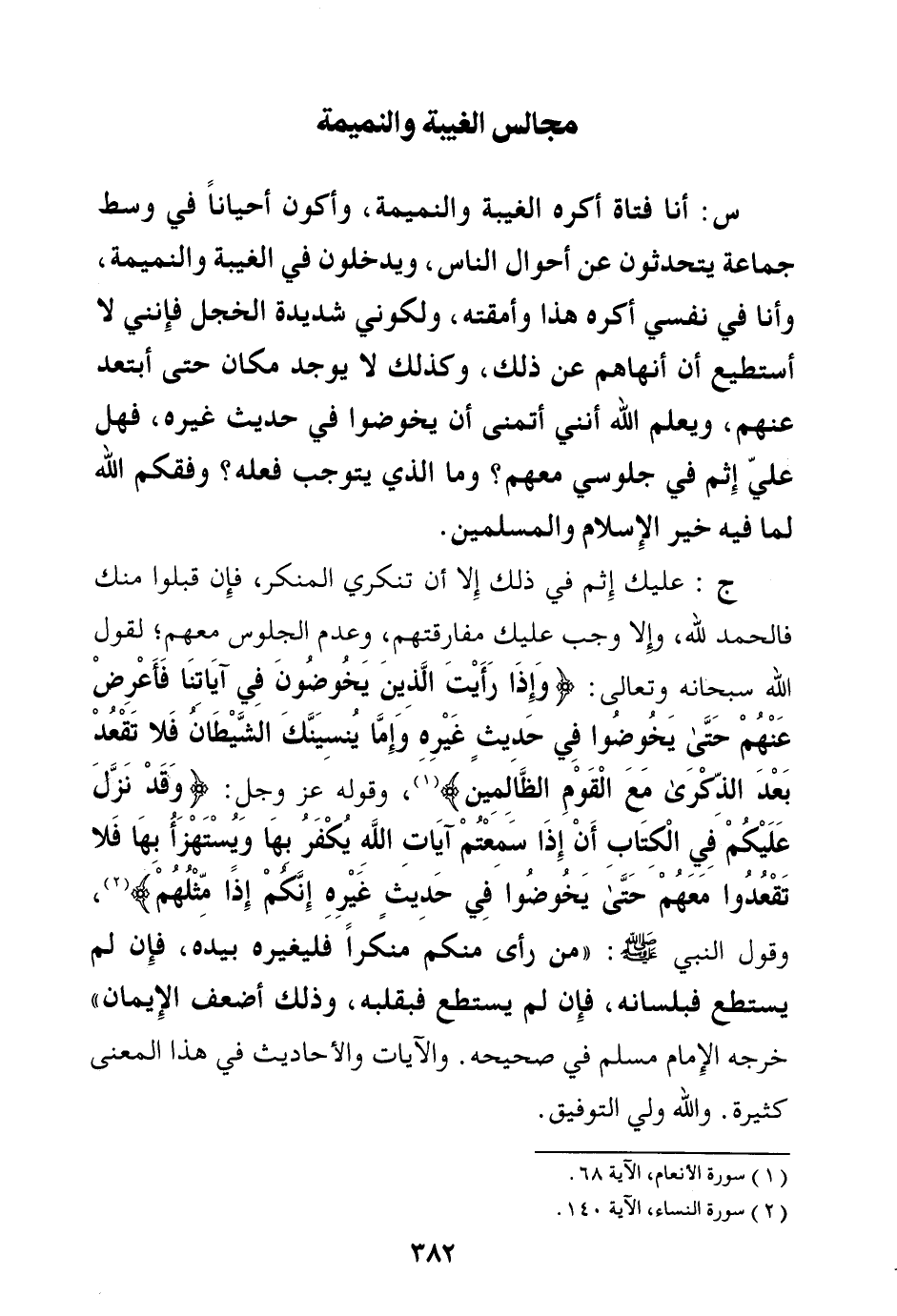 ج: عليك إثم في ذلك إلا أن تنكري المنكر، فإن قبلوا منك فالحمد لله، وإلا وجب عليك مفارقتهم، وعدم الجلوس معهم؛ لقول الله سبحانه وتعالى: {وَإِذَا رَأَيْتَ الَّذِينَ يَخُوضُونَ فِي آيَاتِنَا فَأَعْرِضْ عَنْهُمْ حَتَّى يَخُوضُوا فِي حَدِيثٍ غَيْرِهِ وَإِمَّا يُنْسِيَنَّكَ الشَّيْطَانُ فَلَا تَقْعُدْ بَعْدَ الذِّكْرَى مَعَ الْقَوْمِ الظَّالِمِينَ} (¬1) وقوله عز وجل: {وَقَدْ نَزَّلَ عَلَيْكُمْ فِي الْكِتَابِ أَنْ إِذَا سَمِعْتُمْ آيَاتِ اللَّهِ يُكْفَرُ بِهَا وَيُسْتَهْزَأُ بِهَا فَلَا تَقْعُدُوا مَعَهُمْ حَتَّى يَخُوضُوا فِي حَدِيثٍ غَيْرِهِ إِنَّكُمْ إِذًا مِثْلُهُمْ} (¬2) وقول النبي صلى الله عليه وسلم: «من رأى منكم منكرا فليغيره بيده، فإن لم يستطع فبلسانه، فإن لم يستطع فبقلبه، وذلك أضعف الإيمان (¬3) » ، خرجه الإمام مسلم في صحيحه.