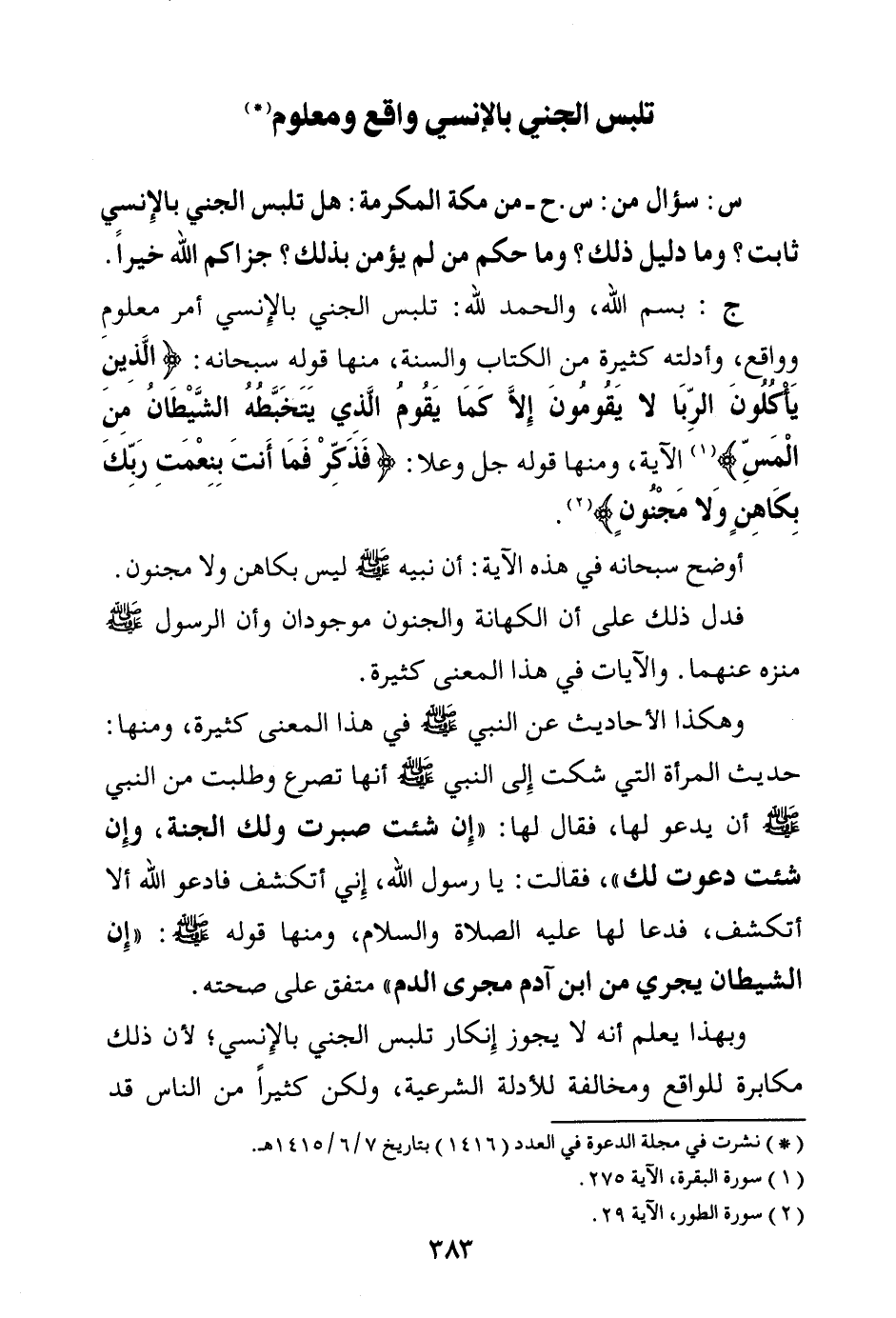 ج: بسم الله، والحمد لله: تلبس الجني بالإنسي أمر معلوم وواقع، وأدلته كثيرة من الكتاب والسنة، منها قوله سبحانه: {الَّذِينَ يَأْكُلُونَ الرِّبَا لَا يَقُومُونَ إِلَّا كَمَا يَقُومُ الَّذِي يَتَخَبَّطُهُ الشَّيْطَانُ مِنَ الْمَسِّ} (¬2) الآية، ومنها قوله جل وعلا: {فَذَكِّرْ فَمَا أَنْتَ بِنِعْمَتِ رَبِّكَ بِكَاهِنٍ وَلَا مَجْنُونٍ} (¬3)