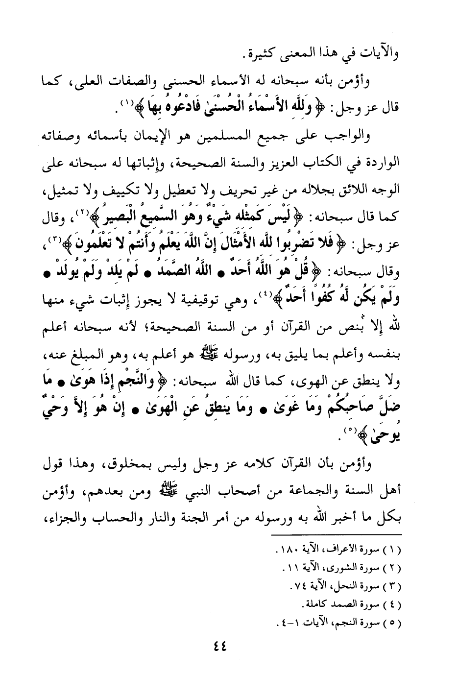 وأؤمن بأنه سبحانه له الأسماء الحسنى والصفات العلى، كما قال عز وجل: {وَلِلَّهِ الْأَسْمَاءُ الْحُسْنَى فَادْعُوهُ بِهَا} (¬1)