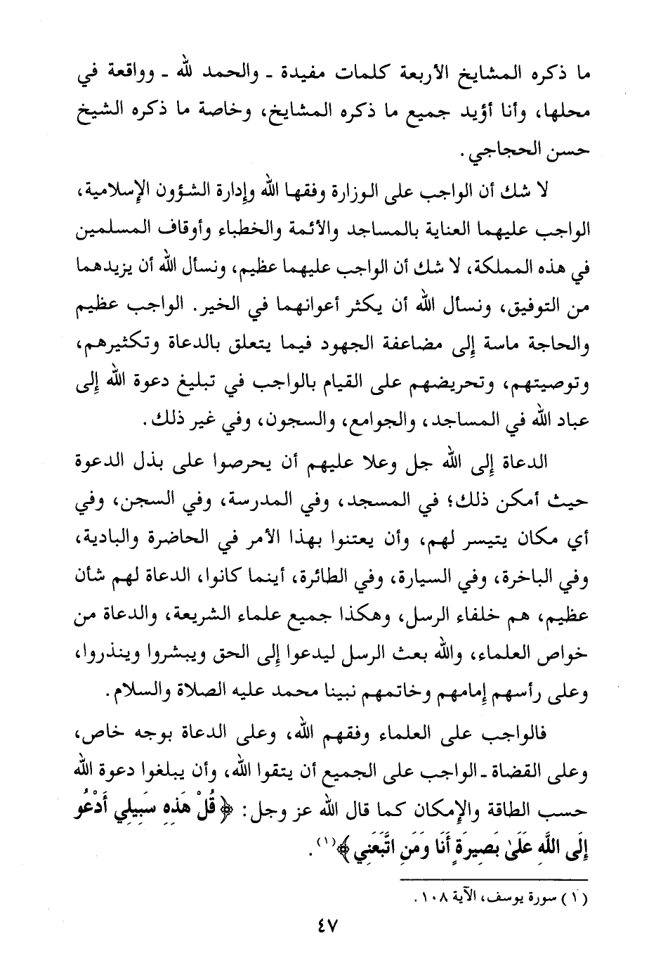 فالواجب على العلماء وفقهم الله، وعلى الدعاة بوجه خاص، وعلى القضاة - الواجب على الجميع أن يتقوا الله، وأن يبلغوا دعوة الله حسب الطاقة والإمكان كما قال الله عز وجل: {قُلْ هَذِهِ سَبِيلِي أَدْعُو إِلَى اللَّهِ عَلَى بَصِيرَةٍ أَنَا وَمَنِ اتَّبَعَنِي} (¬1)