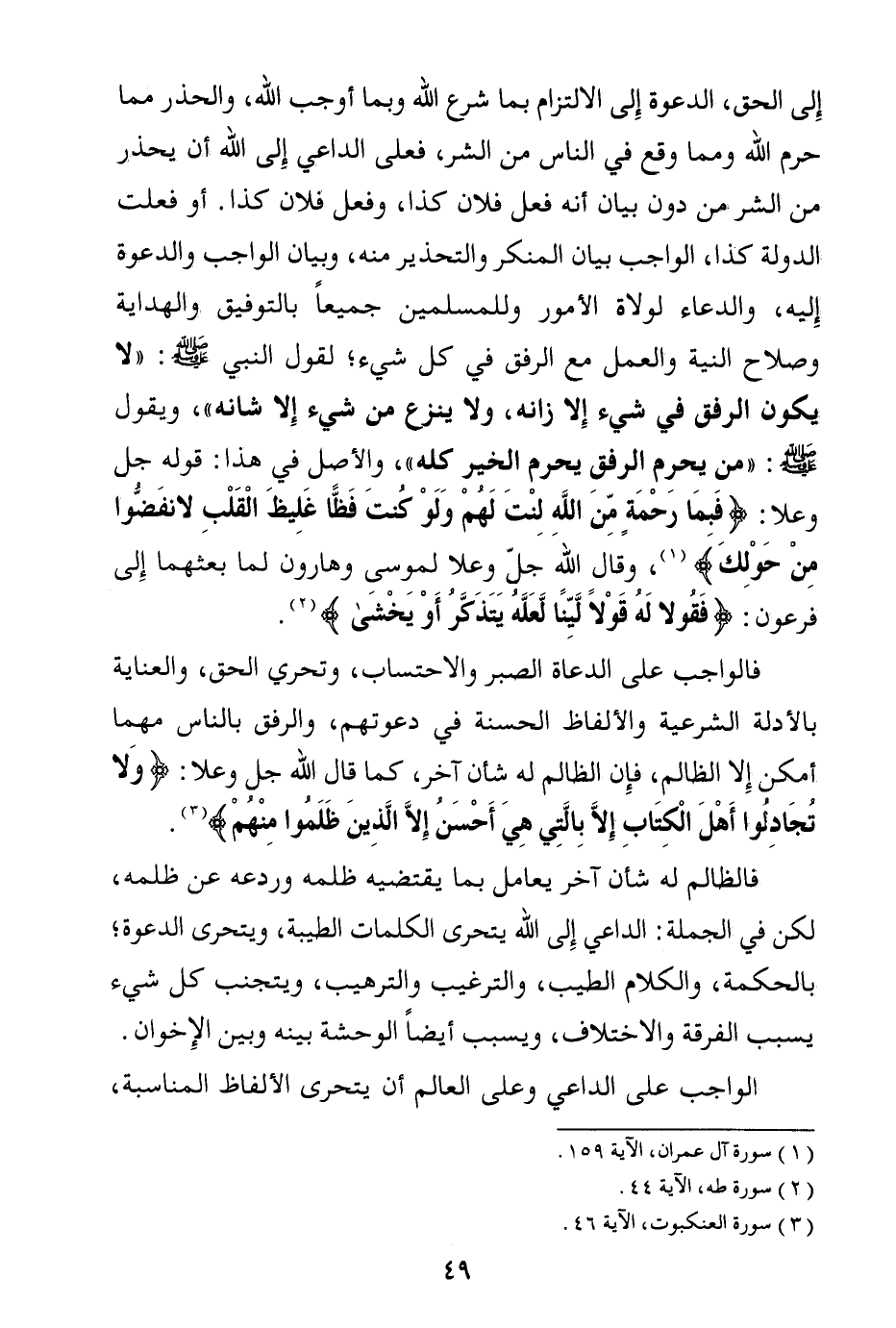 إلى الحق، الدعوة إلى الالتزام بما شرع الله وبما أوجب الله، والحذر مما حرم الله ومما وقع في الناس من الشر، فعلى الداعي إلى الله أن يحذر من الشر من دون بيان أنه فعل فلان كذا، وفعل فلان كذا، أو فعلت الدولة كذا، الواجب بيان المنكر والتحذير منه، وبيان الواجب والدعوة إليه، والدعاء لولاة الأمور وللمسلمين جميعا بالتوفيق والهداية وصلاح النية والعمل مع الرفق في كل شيء؛ لقول النبي صلى الله عليه وسلم: «لا يكون الرفق في شيء إلا زانه، ولا ينزع من شيء إلا شانه (¬1) » ، ويقول صلى الله عليه وسلم: «من يحرم الرفق يحرم الخير كله (¬2) » . والأصل في هذا: قوله جل وعلا: {فَبِمَا رَحْمَةٍ مِنَ اللَّهِ لِنْتَ لَهُمْ وَلَوْ كُنْتَ فَظًّا غَلِيظَ الْقَلْبِ لَانْفَضُّوا مِنْ حَوْلِكَ} (¬3) وقال الله جل وعلا لموسى وهارون لما بعثهما إلى فرعون: {فَقُولَا لَهُ قَوْلًا لَيِّنًا لَعَلَّهُ يَتَذَكَّرُ أَوْ يَخْشَى} (¬4)