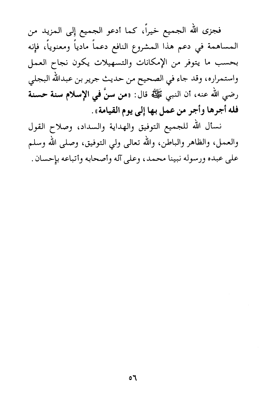 فجزى الله الجميع خيرا، كما أدعو الجميع إلى المزيد من المساهمة في دعم هذا المشروع النافع دعما ماديا ومعنويا، فإنه بحسب ما يتوفر من الإمكانات والتسهيلات يكون نجاح العمل واستمراره، وقد جاء في الصحيح من حديث جرير بن عبد الله البجلي رضي الله عنه، أن النبي صلى الله عليه وسلم قال: «من سن في الإسلام سنة حسنة فله أجرها وأجر من عمل بها إلى يوم القيامة (¬1) » .