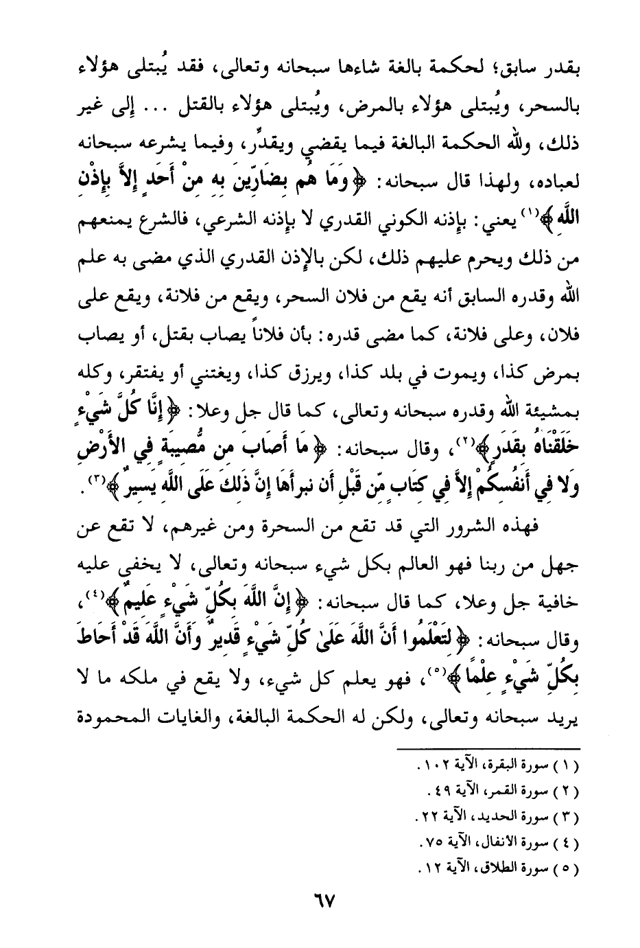 فهذه الشرور التي قد تقع من السحرة ومن غيرهم، لا تقع عن جهل من ربنا فهو العالم بكل شيء سبحانه وتعالى، لا يخفى عليه خافية جل وعلا، كما قال سبحانه: {إِنَّ اللَّهَ بِكُلِّ شَيْءٍ عَلِيمٌ} (¬4) وقال سبحانه: {لِتَعْلَمُوا أَنَّ اللَّهَ عَلَى كُلِّ شَيْءٍ قَدِيرٌ وَأَنَّ اللَّهَ قَدْ أَحَاطَ بِكُلِّ شَيْءٍ عِلْمًا} (¬5) فهو يعلم كل شيء، ولا يقع في ملكه ما لا يريد سبحانه وتعالى، ولكن له الحكمة البالغة، والغايات المحمودة