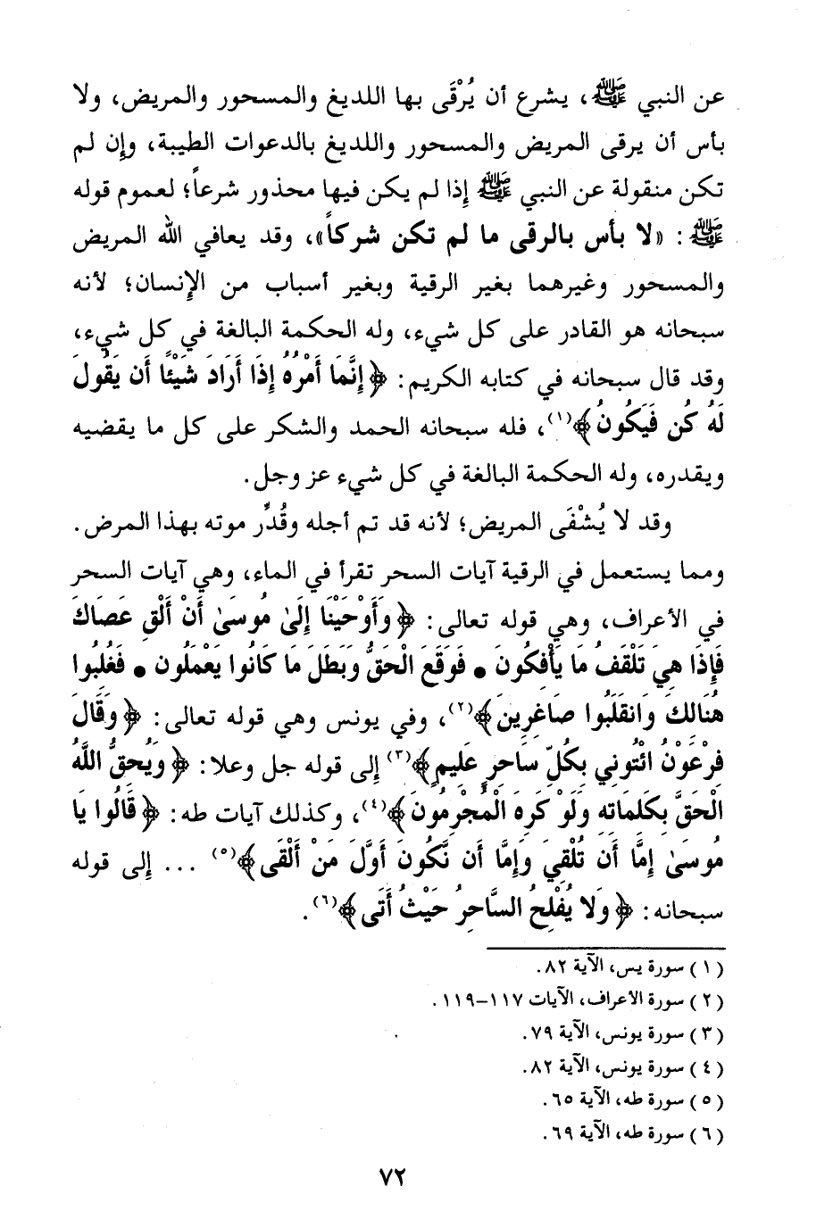 وقد لا يشفى المريض؛ لأنه قد تم أجله وقدر موته بهذا المرض. ومما يستعمل في الرقية آيات السحر تقرأ في الماء، وهي آيات السحر في الأعراف، وهي قوله تعالى: {وَأَوْحَيْنَا إِلَى مُوسَى أَنْ أَلْقِ عَصَاكَ فَإِذَا هِيَ تَلْقَفُ مَا يَأْفِكُونَ} (¬3) {فَوَقَعَ الْحَقُّ وَبَطَلَ مَا كَانُوا يَعْمَلُونَ} (¬4) {فَغُلِبُوا هُنَالِكَ وَانْقَلَبُوا صَاغِرِينَ} (¬5) وفي يونس وهي قوله تعالى: {وَقَالَ فِرْعَوْنُ ائْتُونِي بِكُلِّ سَاحِرٍ عَلِيمٍ} (¬6) إلى قوله جل وعلا: {وَيُحِقُّ اللَّهُ الْحَقَّ بِكَلِمَاتِهِ وَلَوْ كَرِهَ الْمُجْرِمُونَ} (¬7) وكذلك آيات طه: {قَالُوا يَا مُوسَى إِمَّا أَنْ تُلْقِيَ وَإِمَّا أَنْ نَكُونَ أَوَّلَ مَنْ أَلْقَى} (¬8) إلى قوله سبحانه: {وَلَا يُفْلِحُ السَّاحِرُ حَيْثُ أَتَى} (¬9)