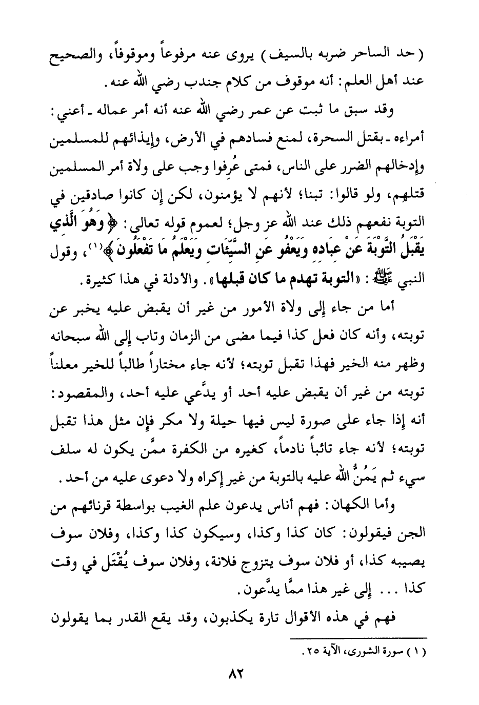 وقد سبق ما ثبت عن عمر رضي الله عنه أنه أمر عماله - أعني: أمراءه- بقتل السحرة، لمنع فسادهم في الأرض، وإيذائهم للمسلمين وإدخالهم الضرر على الناس، فمتى عرفوا وجب على ولاة أمر المسلمين قتلهم، ولو قالوا: تبنا؛ لأنهم لا يؤمنون، لكن إن كانوا صادقين في التوبة نفعهم ذلك عند الله عز وجل؛ لعموم قوله تعالى: {وَهُوَ الَّذِي يَقْبَلُ التَّوْبَةَ عَنْ عِبَادِهِ وَيَعْفُو عَنِ السَّيِّئَاتِ وَيَعْلَمُ مَا تَفْعَلُونَ} (¬1) وقول النبي صلى الله عليه وسلم: «التوبة تهدم ما كان قبلها» . والأدلة في هذا كثيرة.