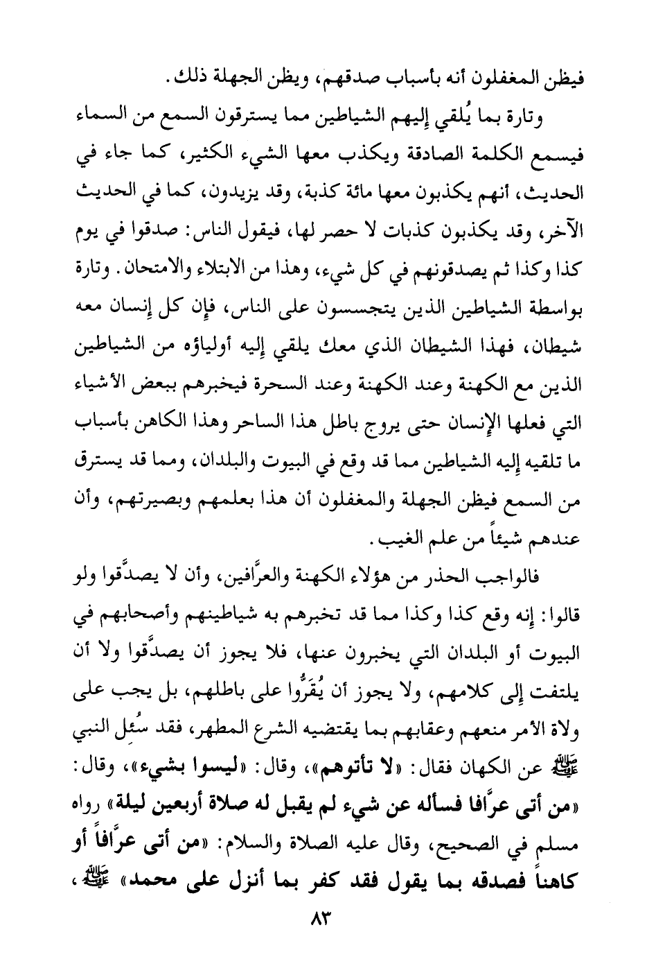 وتارة بواسطة الشياطين الذين يتجسسون على الناس، فإن كل إنسان معه شيطان، فهذا الشيطان الذي معك يلقي إليه أولياؤه من الشياطين الذين مع الكهنة وعند الكهنة وعند السحرة فيخبرهم ببعض الأشياء التي فعلها الإنسان حتى يروج باطل هذا الساحر وهذا الكاهن بأسباب ما تلقيه إليه الشياطين مما قد وقع في البيوت والبلدان، ومما قد يسترق من السمع فيظن الجهلة والمغفلون أن هذا بعلمهم وبصيرتهم، وأن عندهم شيئا من علم الغيب.