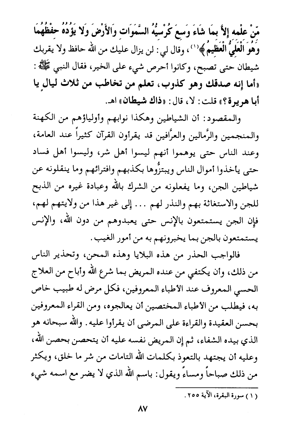 (¬1) سورة البقرة الآية 255 (¬2) {اللَّهُ لَا إِلَهَ إِلَّا هُوَ الْحَيُّ الْقَيُّومُ لَا تَأْخُذُهُ سِنَةٌ وَلَا نَوْمٌ لَهُ مَا فِي السَّمَاوَاتِ وَمَا فِي الْأَرْضِ مَنْ ذَا الَّذِي يَشْفَعُ عِنْدَهُ إِلَّا بِإِذْنِهِ يَعْلَمُ مَا بَيْنَ أَيْدِيهِمْ وَمَا خَلْفَهُمْ وَلَا يُحِيطُونَ بِشَيْءٍ مِنْ عِلْمِهِ إِلَّا بِمَا شَاءَ وَسِعَ كُرْسِيُّهُ السَّمَاوَاتِ وَالْأَرْضَ وَلَا يَئُودُهُ حِفْظُهُمَا وَهُوَ الْعَلِيُّ الْعَظِيمُ}