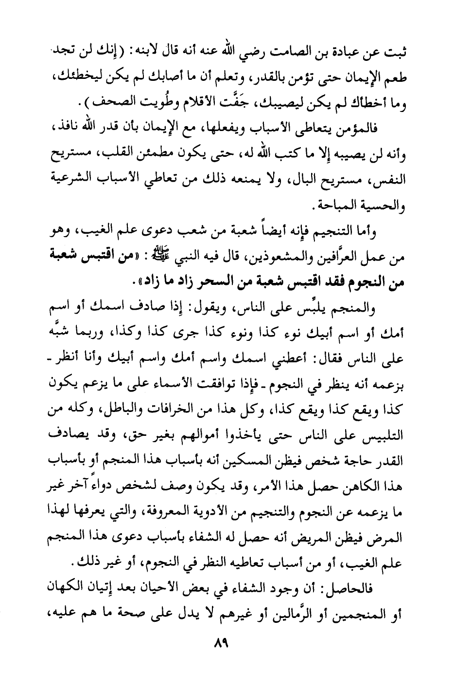 ثبت عن عبادة بن الصامت رضي الله عنه أنه قال لابنه: (إنك لن تجد طعم الإيمان حتى تؤمن بالقدر، وتعلم أن ما أصابك لم يكن ليخطئك، وما أخطأك لم يكن ليصيبك، جفت الأقلام وطويت الصحف) .