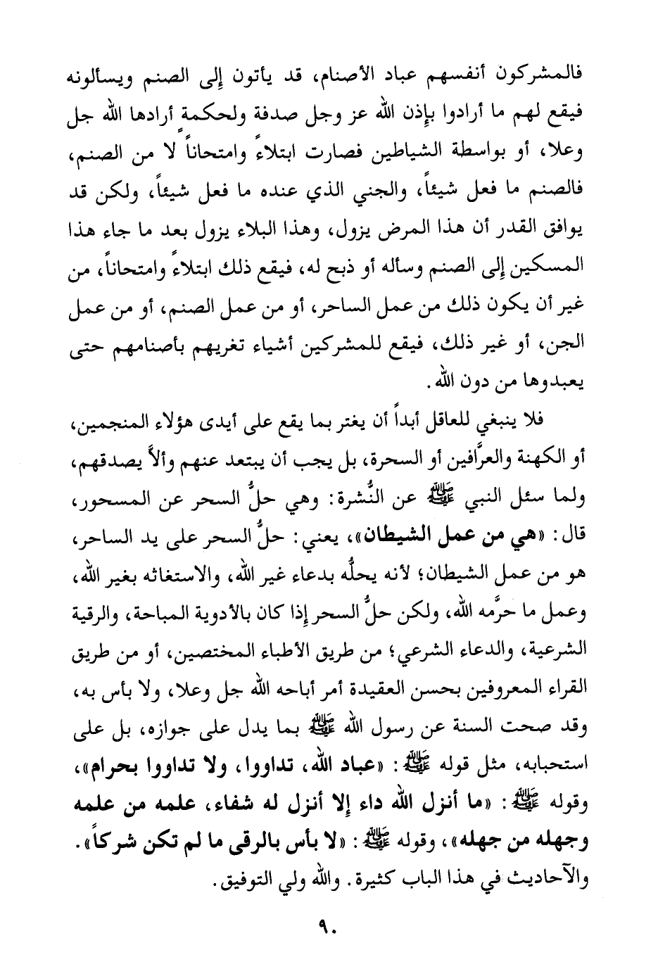 فلا ينبغي للعاقل أبدا أن يغتر بما يقع على أيدي هؤلاء المنجمين، أو الكهنة والعرافين أو السحرة، بل يجب أن يبتعد عنهم وألا يصدقهم، ولما «سئل النبي صلى الله عليه وسلم عن النشرة وهي حل السحر عن المسحور قال: هي من عمل الشيطان (¬1) » يعني: حل السحر على يد الساحر، هو من عمل الشيطان؛ لأنه يحله بدعاء غير الله، والاستغاثة بغير الله، وعمل ما حرمه الله، ولكن حل السحر إذا كان بالأدوية المباحة، والرقية الشرعية، والدعاء الشرعي، من طريق الأطباء المختصين، أو من طريق القراء المعروفين بحسن العقيدة أمر أباحه الله جل وعلا، ولا بأس به، وقد صحت السنة عن رسول الله صلى الله عليه وسلم بما يدل على جوازه، بل على استحبابه، مثل قوله صلى الله عليه وسلم: «عباد الله، تداووا، ولا تداووا بحرام (¬2) » ، وقوله صلى الله عليه وسلم: «ما أنزل الله داء إلا أنزل له شفاء، علمه من علمه، وجهله من جهله (¬3) » ، وقوله صلى الله عليه وسلم: «لا بأس بالرقى ما لم تكن شركا (¬4) » . والأحاديث في هذا الباب كثيرة. والله ولي التوفيق.