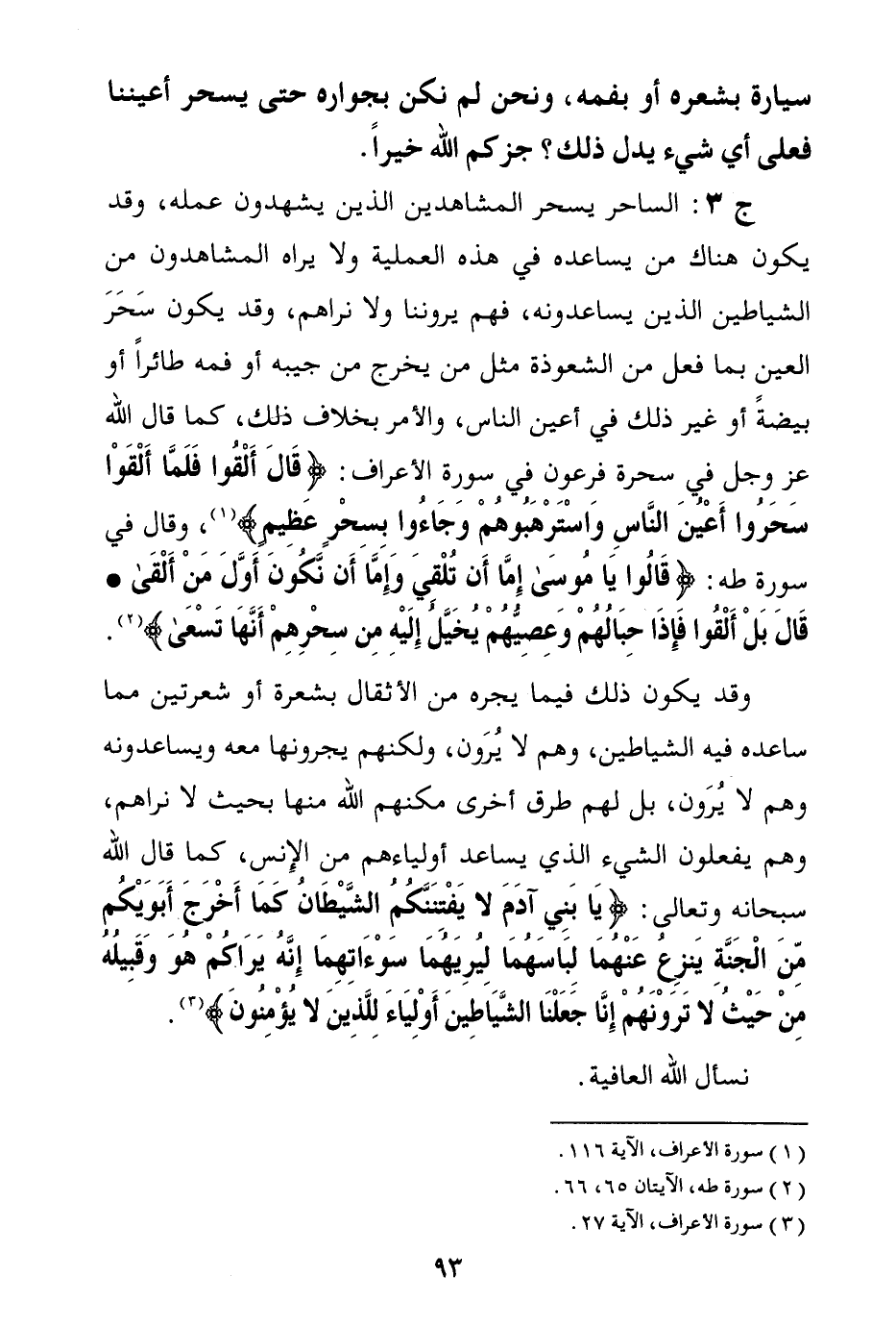 ج3: الساحر يسحر المشاهدين الذين يشهدون عمله، وقد يكون هناك من يساعده في هذه العملية ولا يراه المشاهدون من الشياطين الذين يساعدونه، فهم يروننا ولا نراهم، وقد يكون سحر العين بما فعل من الشعوذة مثل من يخرج من جيبه أو فمه طائرا أو بيضة أو غير ذلك في أعين الناس، والأمر بخلاف ذلك، كما قال الله عز وجل في سحرة فرعون في سورة الأعراف: {قَالَ أَلْقُوا فَلَمَّا أَلْقَوْا سَحَرُوا أَعْيُنَ النَّاسِ وَاسْتَرْهَبُوهُمْ وَجَاءُوا بِسِحْرٍ عَظِيمٍ} (¬1) وقال في سورة طه: {قَالُوا يَا مُوسَى إِمَّا أَنْ تُلْقِيَ وَإِمَّا أَنْ نَكُونَ أَوَّلَ مَنْ أَلْقَى} (¬2) {قَالَ بَلْ أَلْقُوا فَإِذَا حِبَالُهُمْ وَعِصِيُّهُمْ يُخَيَّلُ إِلَيْهِ مِنْ سِحْرِهِمْ أَنَّهَا تَسْعَى} (¬3)