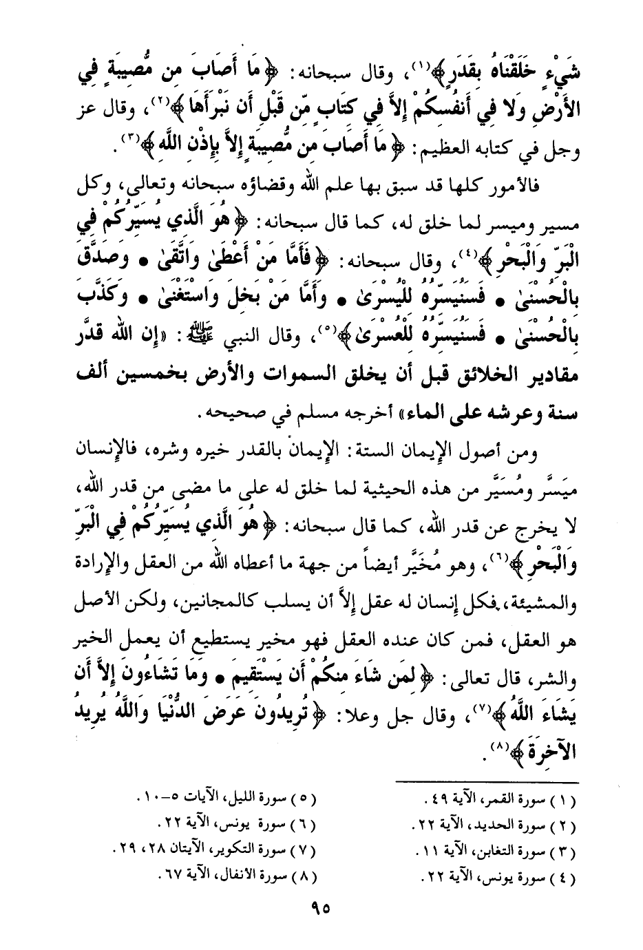 وقال سبحانه: {مَا أَصَابَ مِنْ مُصِيبَةٍ فِي الْأَرْضِ وَلَا فِي أَنْفُسِكُمْ إِلَّا فِي كِتَابٍ مِنْ قَبْلِ أَنْ نَبْرَأَهَا} (¬1) وقال عز وجل في كتابه العظيم: {مَا أَصَابَ مِنْ مُصِيبَةٍ إِلَّا بِإِذْنِ اللَّهِ} (¬2)