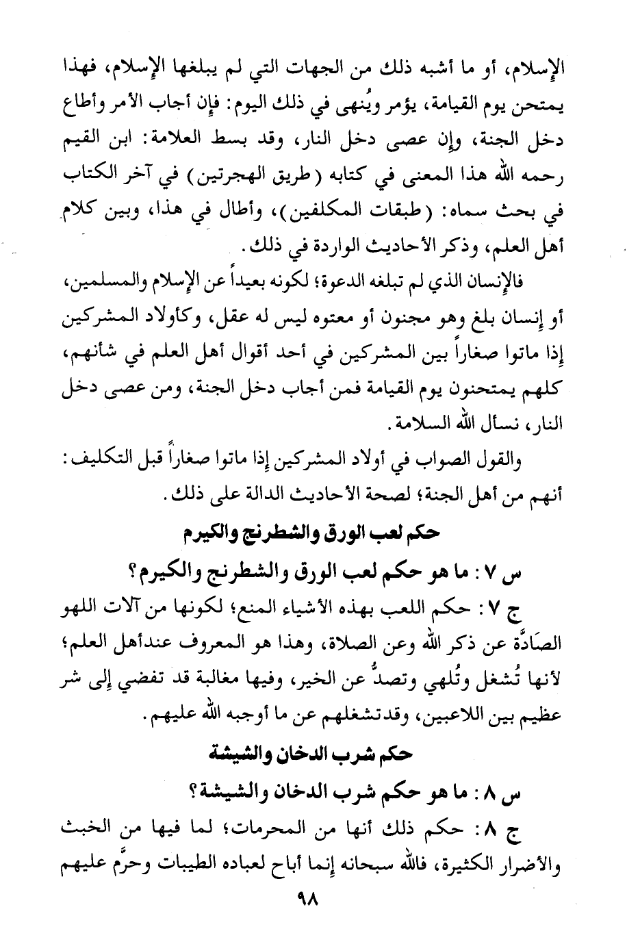 س7: ما هو حكم لعب الورق والشطرنج والكيرم؟