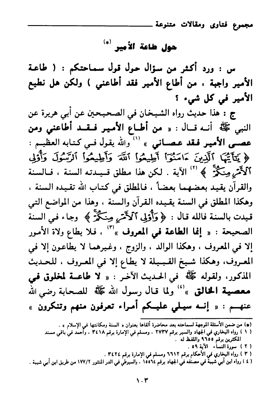 ج: هذا حديث رواه الشيخان في الصحيحين عن أبي هريرة عن النبي صلى الله عليه وسلم أنه قال: «من أطاع الأمير فقد أطاعني ومن عصى الأمير فقد عصاني (¬3) » والله يقول في كتابه العظيم: {يَا أَيُّهَا الَّذِينَ آمَنُوا أَطِيعُوا اللَّهَ وَأَطِيعُوا الرَّسُولَ وَأُولِي الْأَمْرِ مِنْكُمْ} (¬4) الآية.