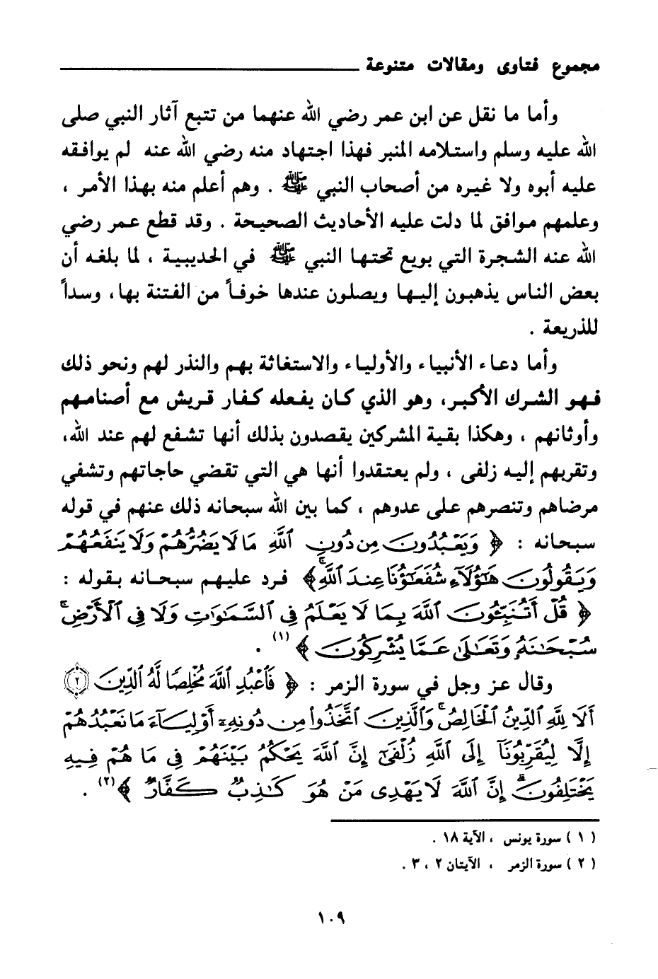 وأما دعاء الأنبياء والأولياء والاستغاثة بهم والنذر لهم ونحو ذلك فهو الشرك الأكبر، وهو الذي كان يفعله كفار قريش مع أصنامهم وأوثانهم، وهكذا بقية المشركين يقصدون بذلك أنها تشفع لهم عند الله، وتقربهم إليه زلفى، ولم يعتقدوا أنها هي التي تقضي حاجاتهم وتشفي مرضاهم وتنصرهم على عدوهم، كما بين الله سبحانه ذلك عنهم في قوله سبحانه: {وَيَعْبُدُونَ مِنْ دُونِ اللَّهِ مَا لَا يَضُرُّهُمْ وَلَا يَنْفَعُهُمْ وَيَقُولُونَ هَؤُلَاءِ شُفَعَاؤُنَا عِنْدَ اللَّهِ} (¬1) فرد عليهم سبحانه بقوله: {قُلْ أَتُنَبِّئُونَ اللَّهَ بِمَا لَا يَعْلَمُ فِي السَّمَاوَاتِ وَلَا فِي الْأَرْضِ سُبْحَانَهُ وَتَعَالَى عَمَّا يُشْرِكُونَ} (¬2) وقال عز وجل في سورة الزمر: {فَاعْبُدِ اللَّهَ مُخْلِصًا لَهُ الدِّينَ} (¬3) {أَلَا لِلَّهِ الدِّينُ الْخَالِصُ وَالَّذِينَ اتَّخَذُوا مِنْ دُونِهِ أَوْلِيَاءَ مَا نَعْبُدُهُمْ إِلَّا لِيُقَرِّبُونَا إِلَى اللَّهِ زُلْفَى إِنَّ اللَّهَ يَحْكُمُ بَيْنَهُمْ فِي مَا هُمْ فِيهِ يَخْتَلِفُونَ إِنَّ اللَّهَ لَا يَهْدِي مَنْ هُوَ كَاذِبٌ كَفَّارٌ} (¬4)