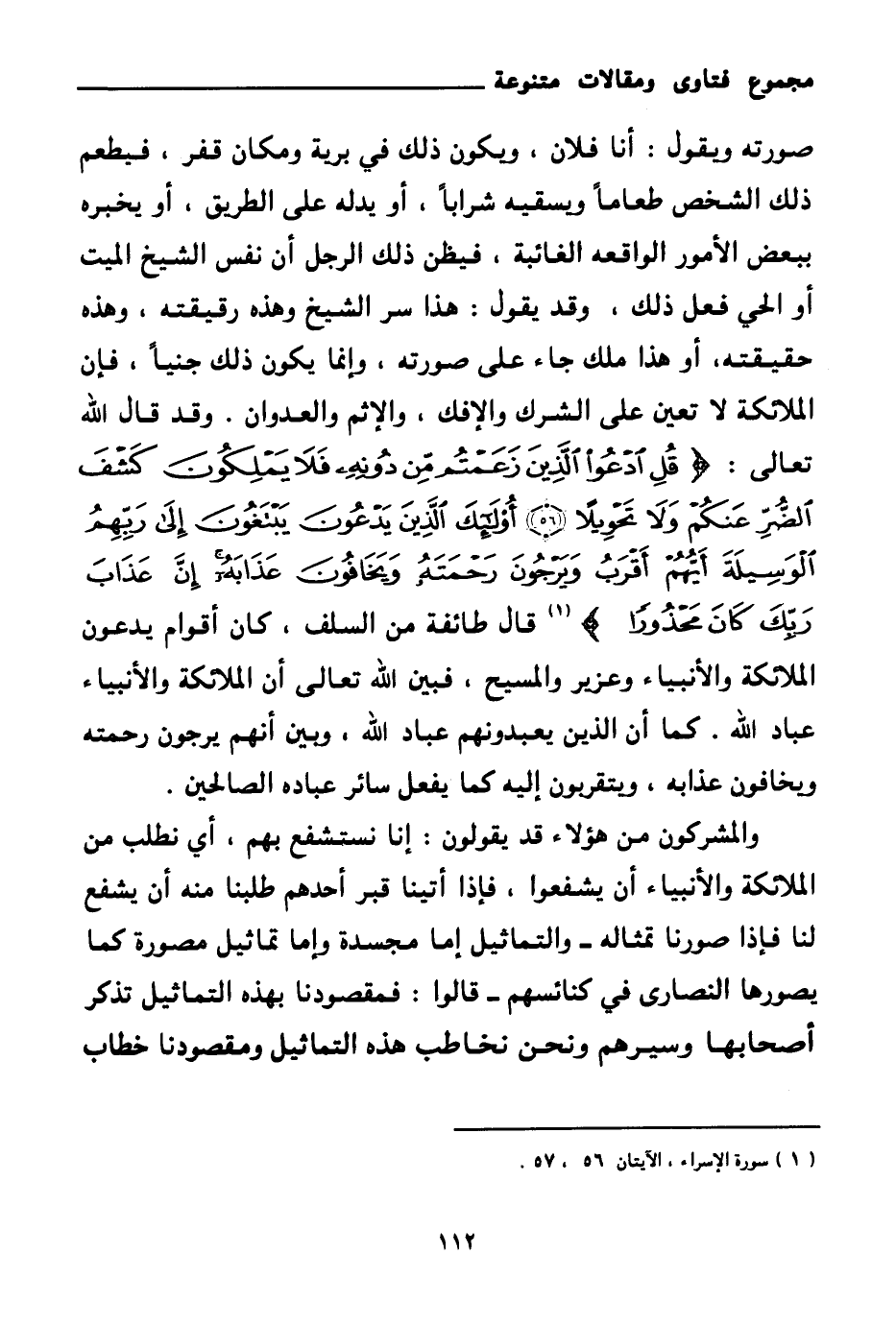 صورته ويقول: أنا فلان، ويكون ذلك في برية ومكان قفر، فيطعم ذلك الشخص طعاما ويسقيه شرابا، أو يدله على الطريق، أو يخبره ببعض الأمور الواقعة الغائبة، فيظن ذلك الرجل أن نفس الشيخ الميت أو الحي فعل ذلك وقد يقول: هذا سر الشيخ وهذه رقيقته، وهذه حقيقته، أو هذا ملك جاء على صورته، وإنما يكون ذلك جنيا، فإن الملائكة لا تعين على الشرك والإفك، والإثم والعدوان. وقد قال الله تعالى: {قُلِ ادْعُوا الَّذِينَ زَعَمْتُمْ مِنْ دُونِهِ فَلَا يَمْلِكُونَ كَشْفَ الضُّرِّ عَنْكُمْ وَلَا تَحْوِيلًا} (¬1) {أُولَئِكَ الَّذِينَ يَدْعُونَ يَبْتَغُونَ إِلَى رَبِّهِمُ الْوَسِيلَةَ أَيُّهُمْ أَقْرَبُ وَيَرْجُونَ رَحْمَتَهُ وَيَخَافُونَ عَذَابَهُ إِنَّ عَذَابَ رَبِّكَ كَانَ مَحْذُورًا} (¬2) قال طائفة من السلف، كان أقوام يدعون الملائكة والأنبياء وعزير والمسيح، فبين الله تعالى أن الملائكة والأنبياء عباد الله كما أن الذين يعبدونهم عباد الله، وبين أنهم يرجون رحمته ويخافون عذابه ويتقربون إليه كما يفعل سائر عباده الصالحين.