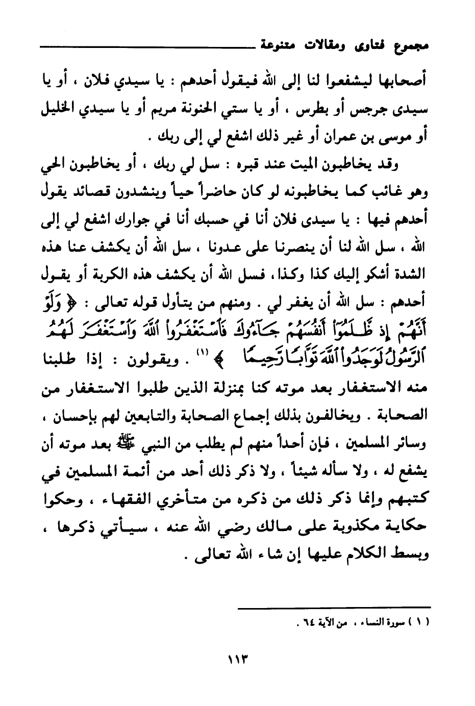 وقد يخاطبون الميت عند قبره: سل لي ربك، أو يخاطبون الحي وهو غائب كما يخاطبونه لو كان حاضرا حيا وينشدون قصائد يقول أحدهم فيها: يا سيدى فلان أنا في حسبك، أنا في جوارك، اشفع لي إلى الله، سل الله لنا أن ينصرنا على عدونا، سل الله أن يكشف عنا هذه الشدة، أشكو إليك كذا وكذا، فسل الله أن يكشف هذه الكربة أو يقول أحدهم: سل الله أن يغفر لي ومنهم من يتأول قوله تعالى: {وَلَوْ أَنَّهُمْ إِذْ ظَلَمُوا أَنْفُسَهُمْ جَاءُوكَ فَاسْتَغْفَرُوا اللَّهَ وَاسْتَغْفَرَ لَهُمُ الرَّسُولُ لَوَجَدُوا اللَّهَ تَوَّابًا رَحِيمًا} (¬1) ويقولون: إذا طلبنا منه الاستغفار بعد موته كنا بمنزلة الذين طلبوا الاستغفار من الصحابة.
