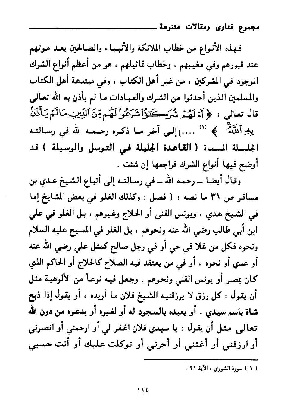 فهذه الأنواع من خطاب الملائكة والأنبياء والصالحين بعد موتهم عند قبورهم وفي مغيبهم، وخطاب تماثيلهم، هو من أعظم أنواع الشرك الموجود في المشركين، من غير أهل الكتاب، وفي مبتدعة أهل الكتاب والمسلمين الذين أحدثوا من الشرك والعبادات ما لم يأذن به الله تعالى، قال تعالى: {أَمْ لَهُمْ شُرَكَاءُ شَرَعُوا لَهُمْ مِنَ الدِّينِ مَا لَمْ يَأْذَنْ بِهِ اللَّهُ} (¬1) إلى آخر ما ذكره رحمه الله في رسالته الجليلة المسماة (القاعدة الجليلة في التوسل والوسيلة) قد أوضح فيها أنواع الشرك فراجعها إن شئت.
