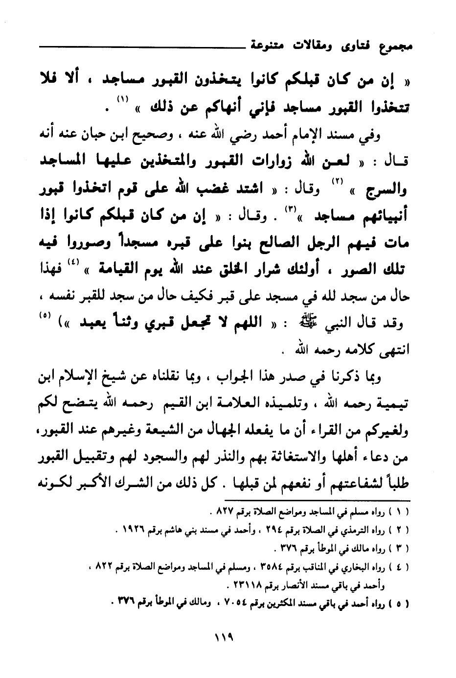 وفي مسند الإمام أحمد رضي الله عنه، وصحيح ابن حبان عنه أنه قال: «لعن الله زوارات القبور والمتخذين عليها المساجد والسرج (¬2) » وقال: «اشتد غضب الله على قوم اتخذوا قبور أنبيائهم مساجد (¬3) » وقال: «إن من كان قبلكم كانوا إذا مات فيهم الرجل الصالح بنوا على قبره مسجدا وصوروا فيه تلك الصور وأولئك شرار الخلق عند الله يوم القيامة (¬4) » فهذا حال من سجد لله في مسجد على قبر فكيف حال من سجد للقبر نفسه، وقد قال النبي صلى الله عليه وسلم: «اللهم لا تجعل قبري وثنا يعبد» انتهى كلامه رحمه الله.