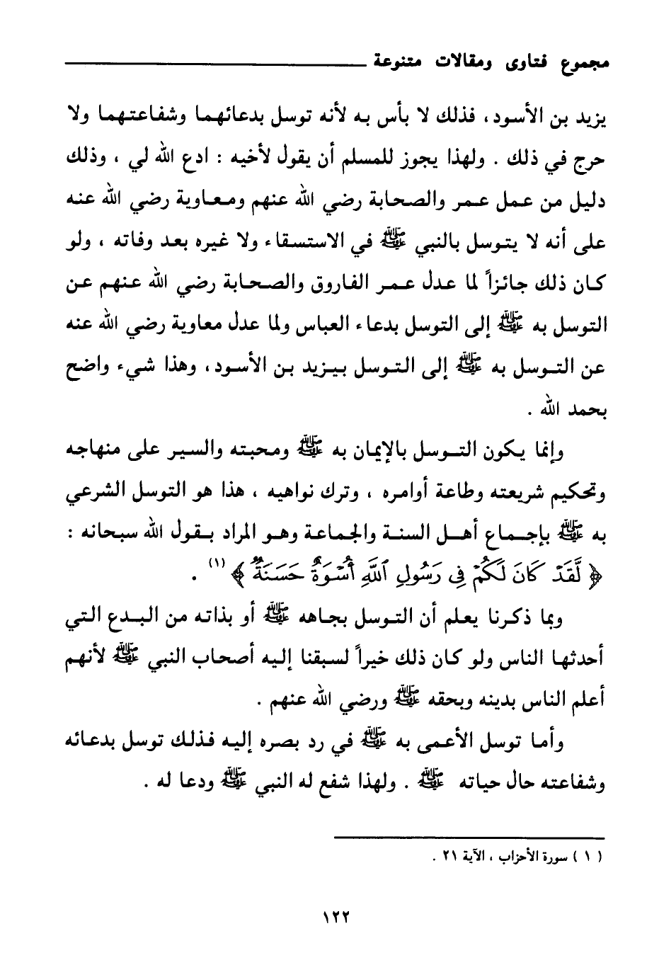 وإنما يكون التوسل بالإيمان به صلى الله عليه وسلم ومحبته والسير على منهاجه وتحكيم شريعته وطاعة أوامره، وترك نواهيه، هذا هو التوسل الشرعي به صلى الله عليه وسلم بإجماع أهل السنة والجماعة وهو المراد بقول الله سبحانه: {لَقَدْ كَانَ لَكُمْ فِي رَسُولِ اللَّهِ أُسْوَةٌ حَسَنَةٌ} (¬1)