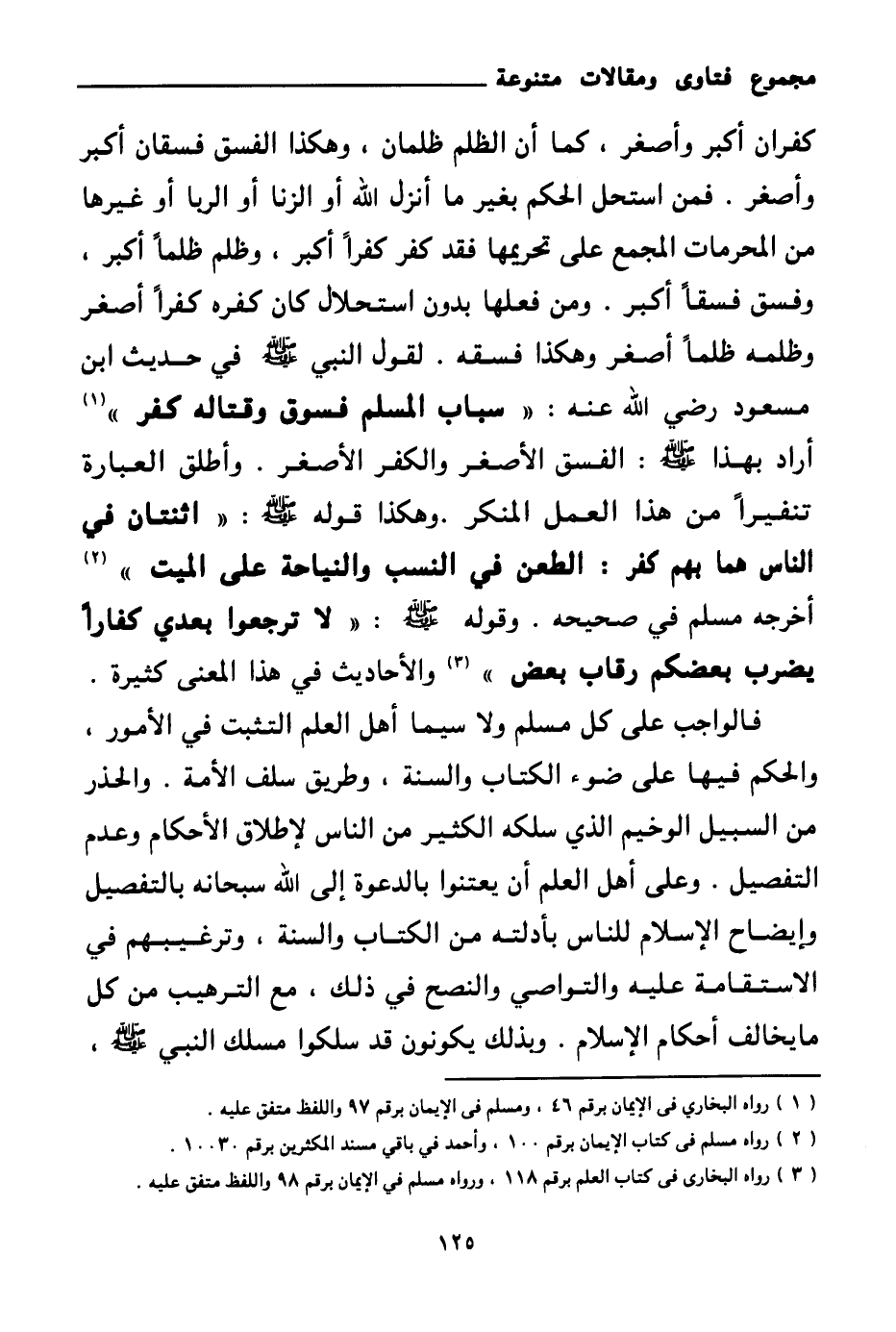 كفران أكبر وأصغر، كما أن الظلم ظلمان، وهكذا الفسق فسقان أكبر وأصغر. فمن استحل الحكم بغير ما أنزل الله أو الزنا أو الربا أو غيرها من المحرمات المجمع على تحريمها فقد كفر كفرا أكبر، وظلم ظلما أكبر، وفسق فسقا أكبر. ومن فعلها بدون استحلال كان كفره كفرا أصغر وظلمه ظلما أصغر وهكذا فسقه. لقول النبي صلى الله عليه وسلم في حديث ابن مسعود رضي الله عنه: «سباب المسلم فسوق وقتاله كفر (¬1) » أراد بهذا صلى الله عليه وسلم: الفسق الأصغر والكفر الأصغر. وأطلق العبارة تنفيرا من هذا العمل المنكر. وهكذا قوله صلى الله عليه وسلم: «اثنتان في الناس هما بهم كفر: الطعن في النسب، والنياحة على الميت (¬2) » . أخرجه مسلم في صحيحه. وقوله صلى الله عليه وسلم: «لا ترجعوا بعدي كفارا يضرب بعضكم رقاب بعض (¬3) » والأحاديث في هذا المعنى كثيرة.