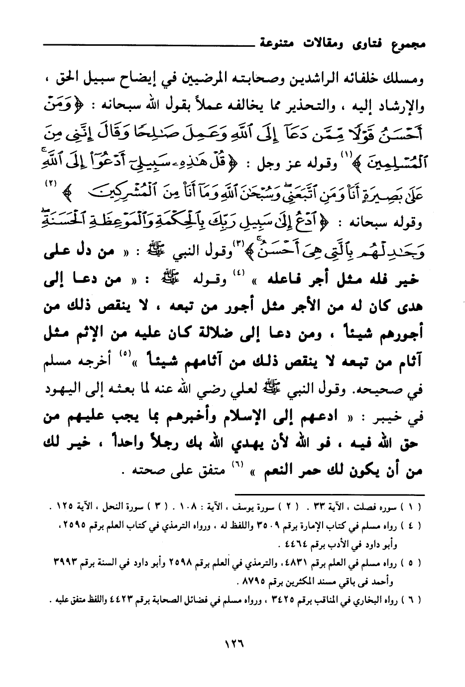 ومسلك خلفائه الراشدين وصحابته المرضيين في إيضاح سبيل الحق، والإرشاد إليه، والتحذير مما يخالفه عملا بقول الله سبحانه: {وَمَنْ أَحْسَنُ قَوْلًا مِمَّنْ دَعَا إِلَى اللَّهِ وَعَمِلَ صَالِحًا وَقَالَ إِنَّنِي مِنَ الْمُسْلِمِينَ} (¬1) وقوله عز وجل: {قُلْ هَذِهِ سَبِيلِي أَدْعُو إِلَى اللَّهِ عَلَى بَصِيرَةٍ أَنَا وَمَنِ اتَّبَعَنِي وَسُبْحَانَ اللَّهِ وَمَا أَنَا مِنَ الْمُشْرِكِينَ} (¬2) وقوله سبحانه: {ادْعُ إِلَى سَبِيلِ رَبِّكَ بِالْحِكْمَةِ وَالْمَوْعِظَةِ الْحَسَنَةِ وَجَادِلْهُمْ بِالَّتِي هِيَ أَحْسَنُ} (¬3) وقول النبي صلى الله عليه وسلم: «من دل على خير فله مثل أجر فاعله (¬4) » وقوله صلى الله عليه وسلم: «من دعا إلى هدى كان له من الأجر مثل أجور من تبعه لا ينقص ذلك من أجورهم شيئا، ومن دعا إلى ضلالة كان عليه من الإثم مثل آثام من تبعه لا ينقص ذلك من آثامهم شيئا (¬5) » أخرجه مسلم في صحيحه وقول النبي صلى الله عليه وسلم لعلي رضي الله عنه لما بعثه إلى اليهود في خيبر: «ادعهم إلى الإسلام وأخبرهم بما يجب عليهم من حق الله فيه فوالله لأن يهدي الله بك رجلا واحدا خير لك من أن يكون لك حمر النعم (¬6) » متفق على صحته.