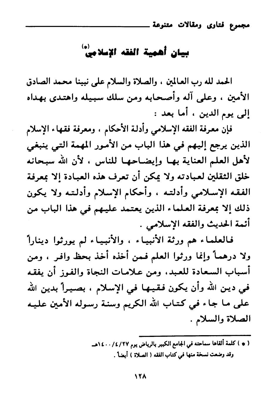 فإن معرفة الفقه الإسلامي وأدلة الأحكام، ومعرفة فقهاء الإسلام الذين يرجع إليهم في هذا الباب من الأمور المهمة التي ينبغي لأهل العلم العناية بها وإيضاحها للناس، لأن الله سبحانه خلق الثقلين لعبادته ولا يمكن أن تعرف هذه العبادة إلا بمعرفة الفقه الإسلامي وأدلته، وأحكام الإسلام وأدلته ولا يكون ذلك إلا بمعرفة العلماء الذين يعتمد عليهم في هذا الباب من أئمة الحديث والفقه الإسلامي.