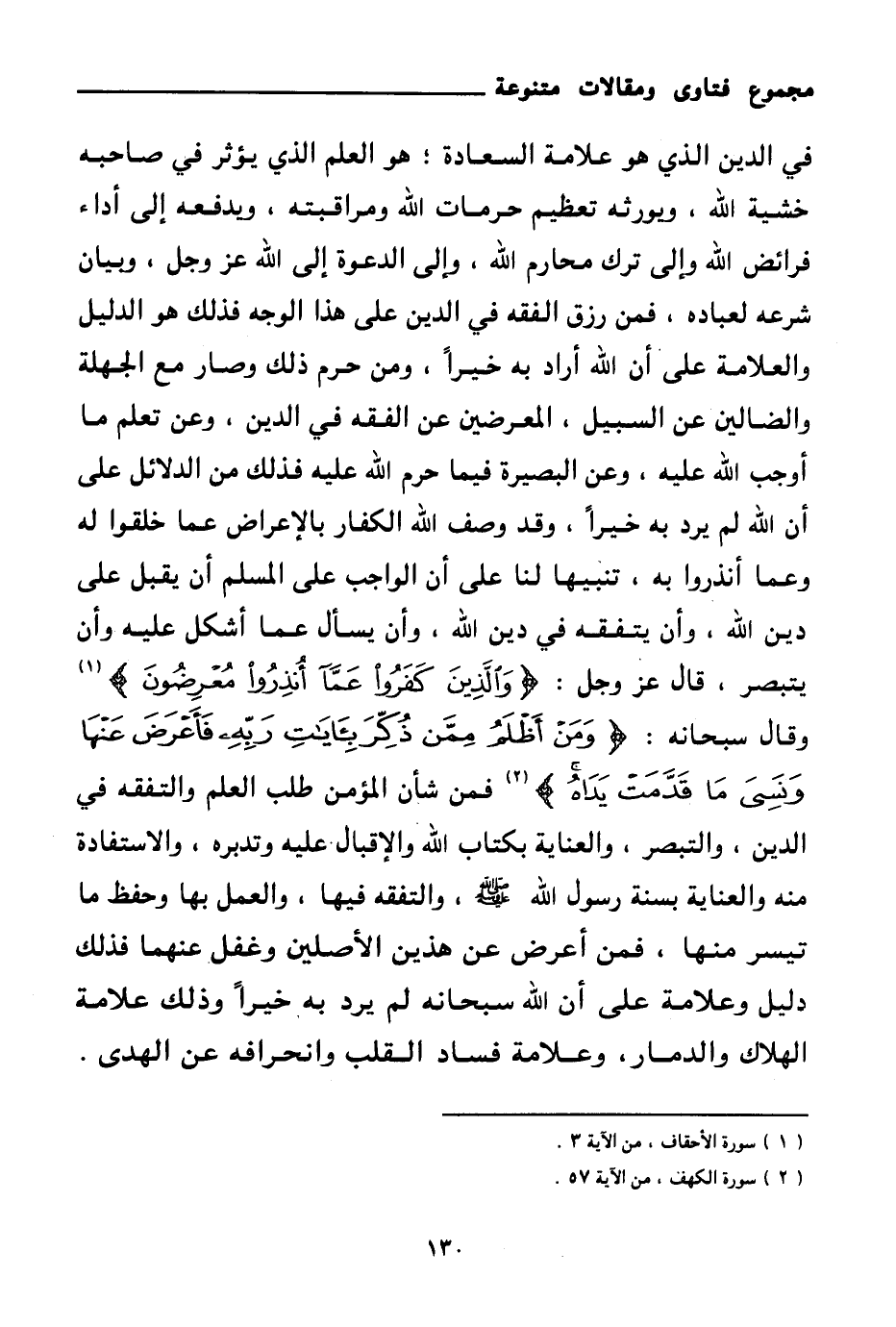 في الدين الذي هو علامة السعادة، هو العلم الذي يؤثر في صاحبه خشية الله، ويورثه تعظيم حرمات الله ومراقبته، ويدفعه إلى أداء فرائض الله وإلى ترك محارم الله، وإلى الدعوة إلى الله عز وجل، وبيان شرعه لعباده، فمن رزق الفقه في الدين على هذا الوجه فذلك هو الدليل والعلامة على أن الله أراد به خيرا، ومن حرم ذلك وصار مع الجهلة والضالين عن السبيل، المعرضين عن الفقه في الدين، وعن تعلم ما أوجب الله عليه، وعن البصيرة فيما حرم الله عليه فذلك من الدلائل على أن الله لم يرد به خيرا، وقد وصف الله الكفار بالإعراض عما خلقوا له وعما أنذروا به، تنبيها لنا على أن الواجب على المسلم أن يقبل على دين الله، وأن يتفقه في دين الله، وأن يسأل عما أشكل عليه وأن يتبصر، قال عز وجل: {وَالَّذِينَ كَفَرُوا عَمَّا أُنْذِرُوا مُعْرِضُونَ} (¬1) وقال سبحانه: {وَمَنْ أَظْلَمُ مِمَّنْ ذُكِّرَ بِآيَاتِ رَبِّهِ فَأَعْرَضَ عَنْهَا وَنَسِيَ مَا قَدَّمَتْ يَدَاهُ} (¬2)